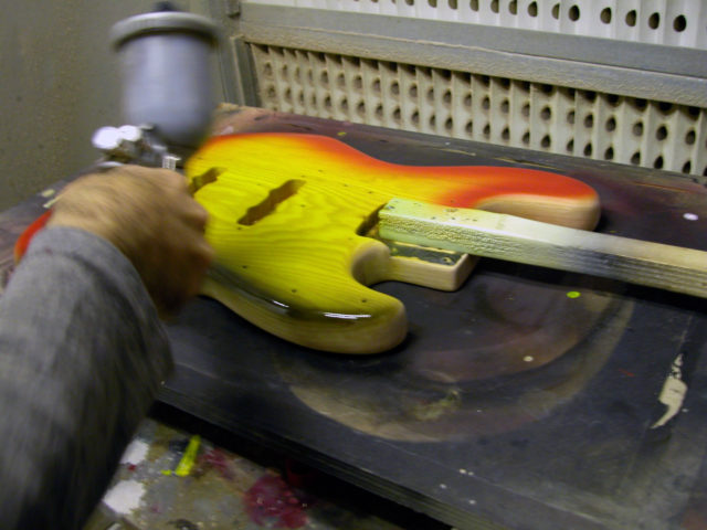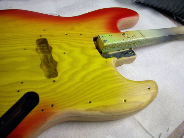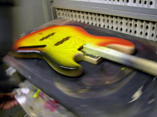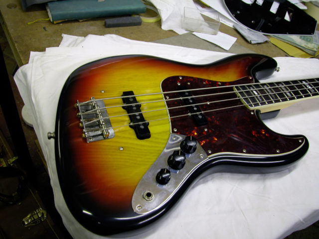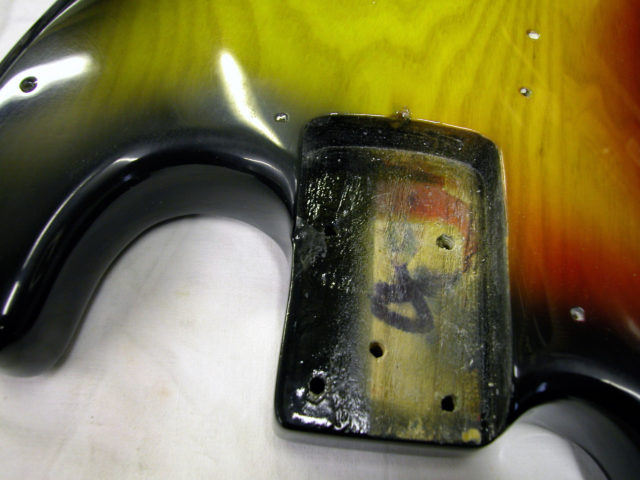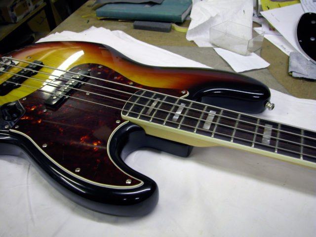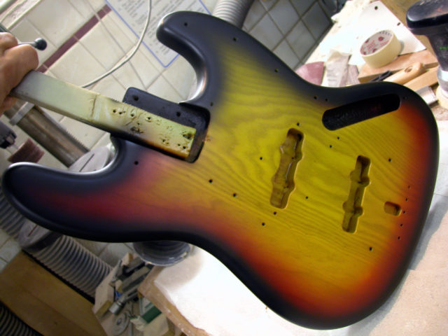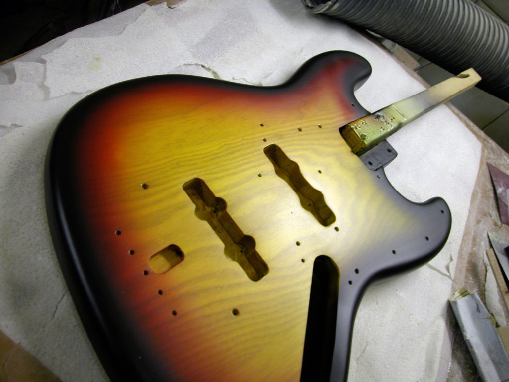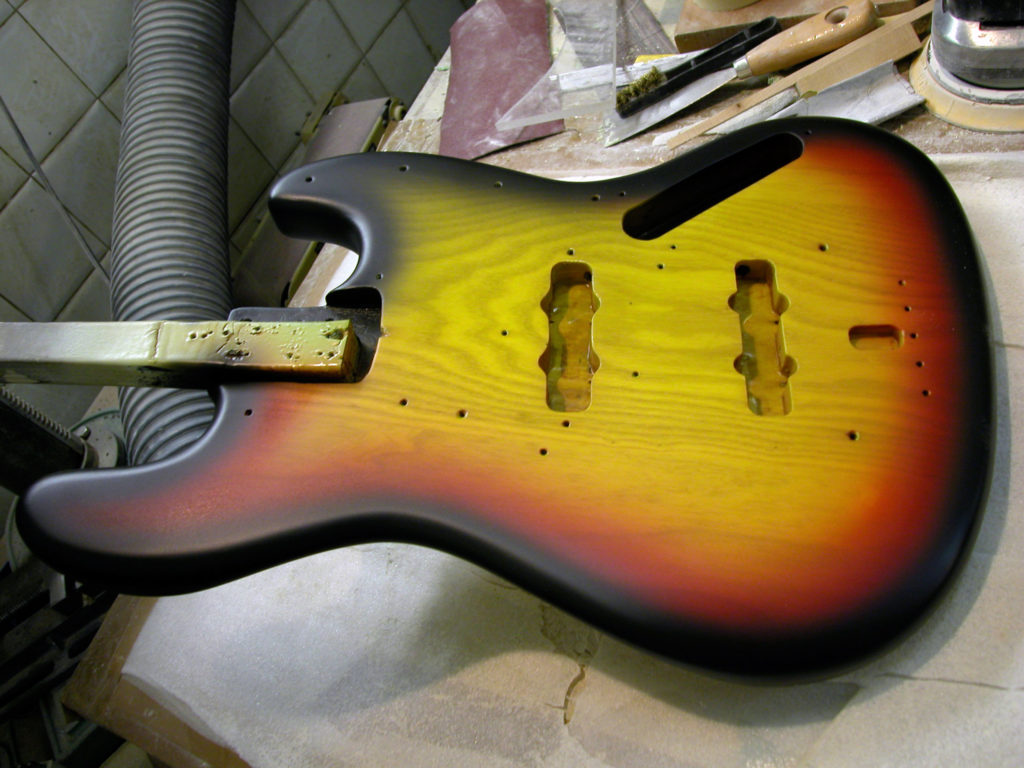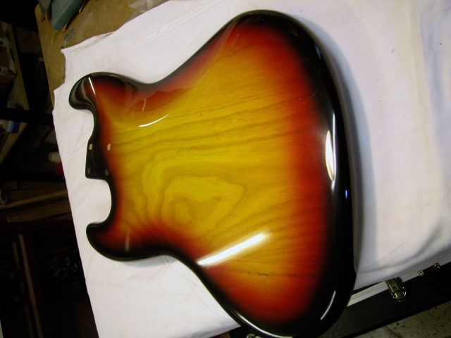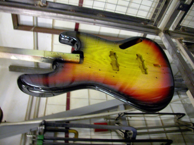 Nel frattempo il corpo era stato ripreparato per una finitura di color sunburst 3 toni tipica di quel periodo. Il colore originale presente negli scassi dei pickups dei controlli e nella tasca del manico è stato conservato e raccordato con la nuova colorazione in modo da ottenere un risultato ottimale.