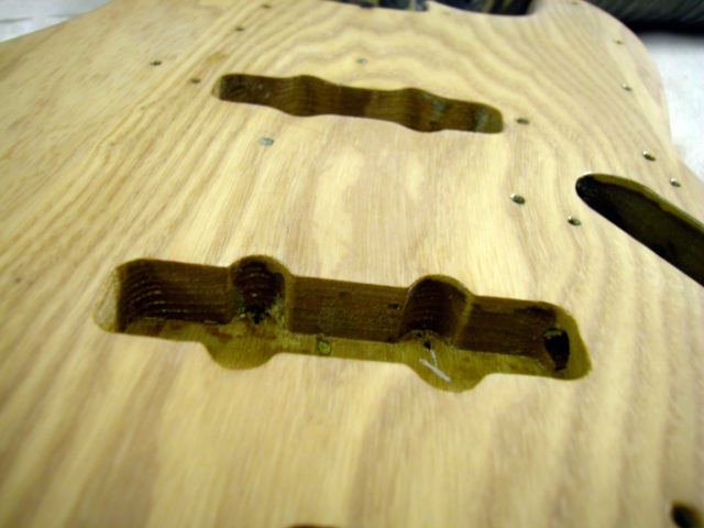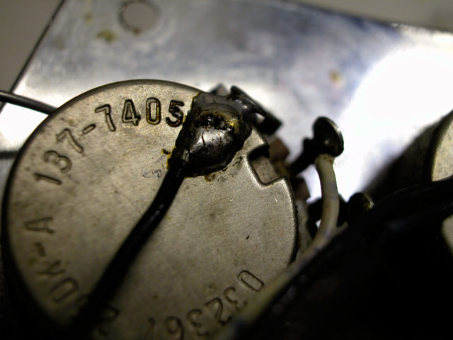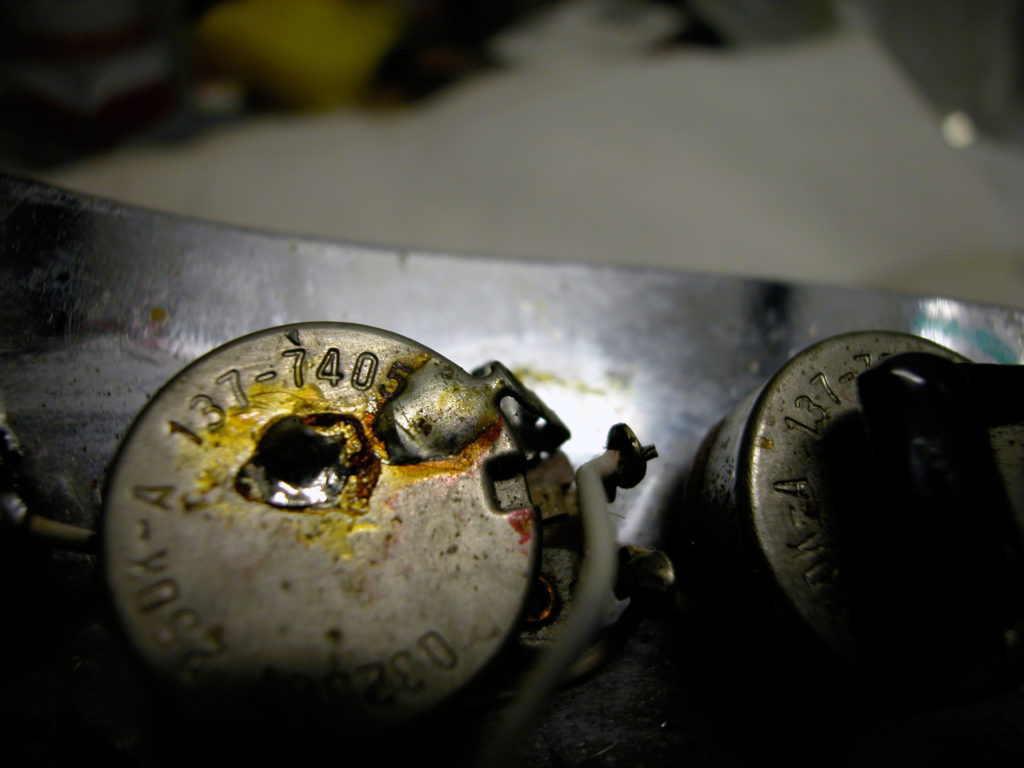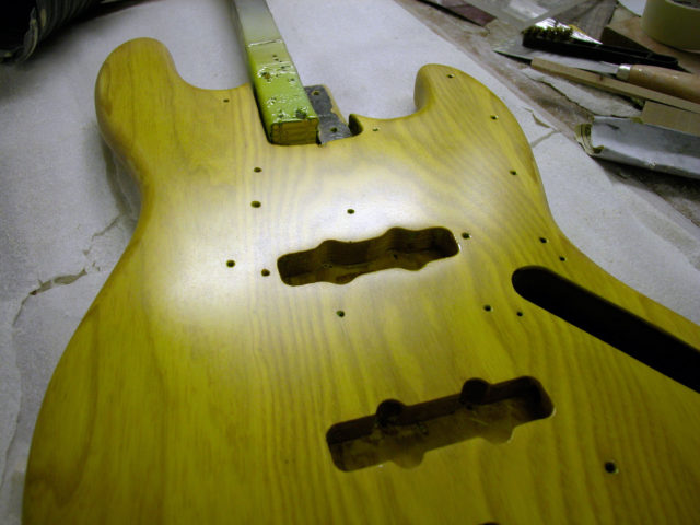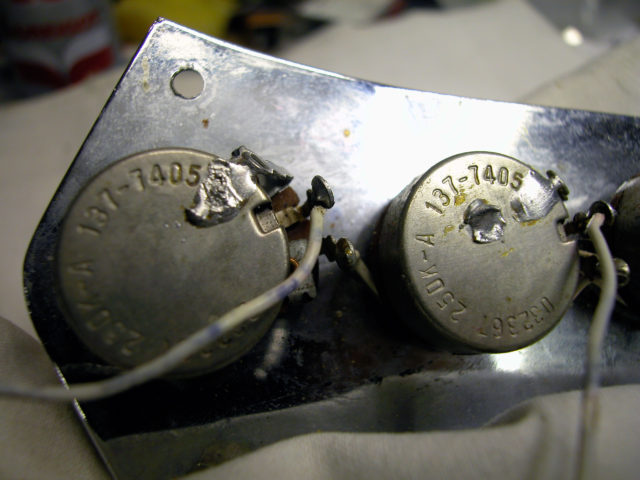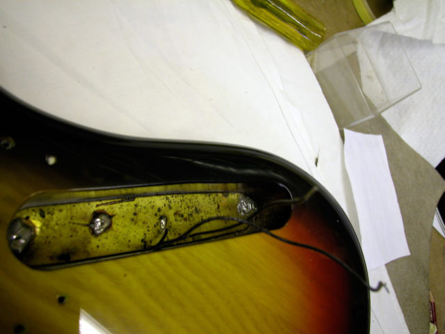 A questo punto sia il corpo che il manico ormai aposto, potevano essere assemblati insieme con una particolare cura anche nel ricablaggio della parte elettronica e delle schermature tipiche in ottone. Notare la ripulitura dei potenziometri.
