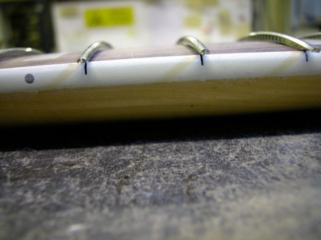 Eseguita questa operazione è stato necessario rifilare i frets e passare al ripristino del binding. In origine esso formava un dentino che si appoggiava all’estremità dei tasti.