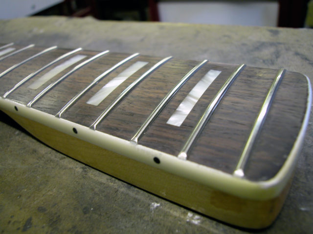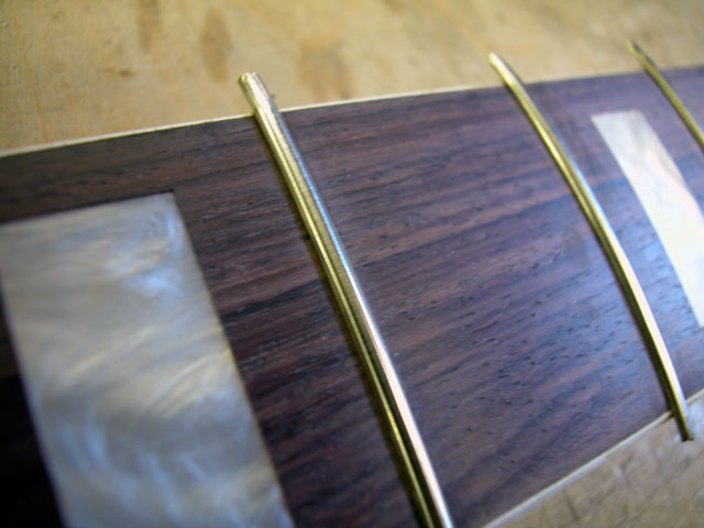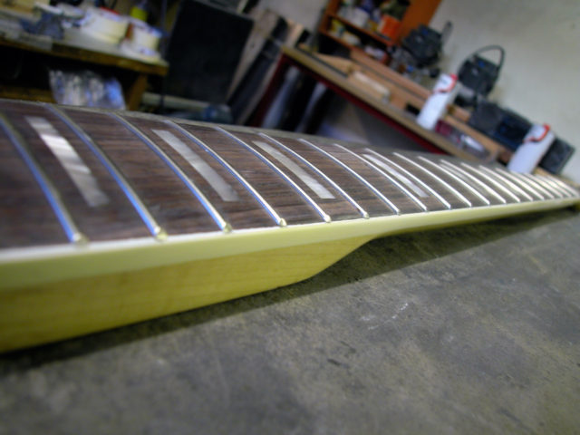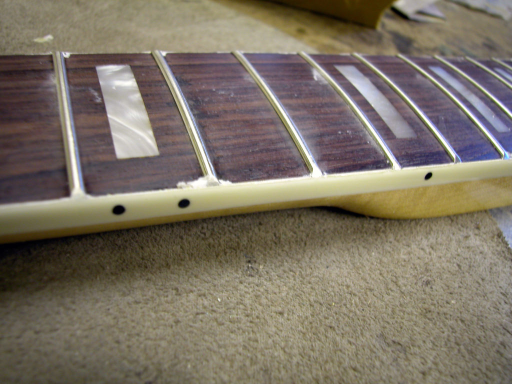 Dopo avere raddrizzato il manico abbiamo presentato i nuovi tasti originali sulla tastiera e dopo esserci assicurati che la loro sede fosse aposto siamo passati al piantaggio dei frets facendoli una scanalatura che permettesse l’inserimento della celluloide in un secondo tempo.