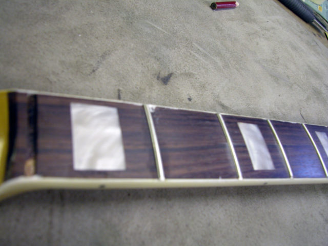 Per prima cosa occorreva togliere quei brutti tasti mal messi e ripristinare sia gli intagli, il binding e ovviamente raddrizzare il manico stesso.