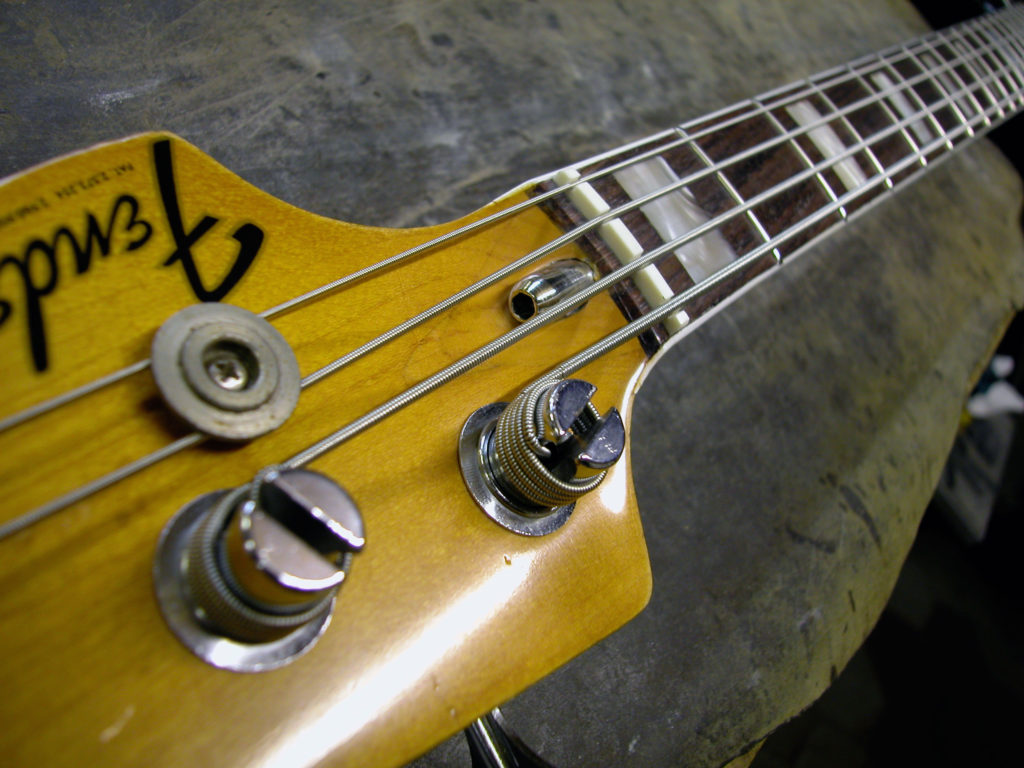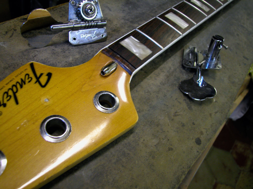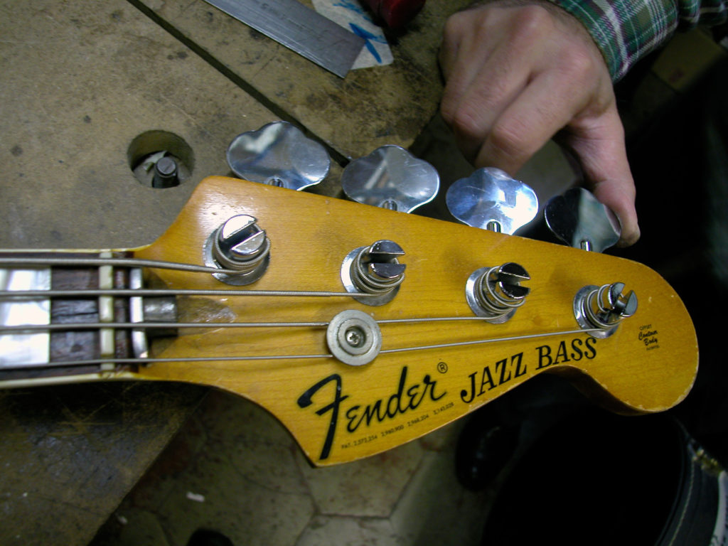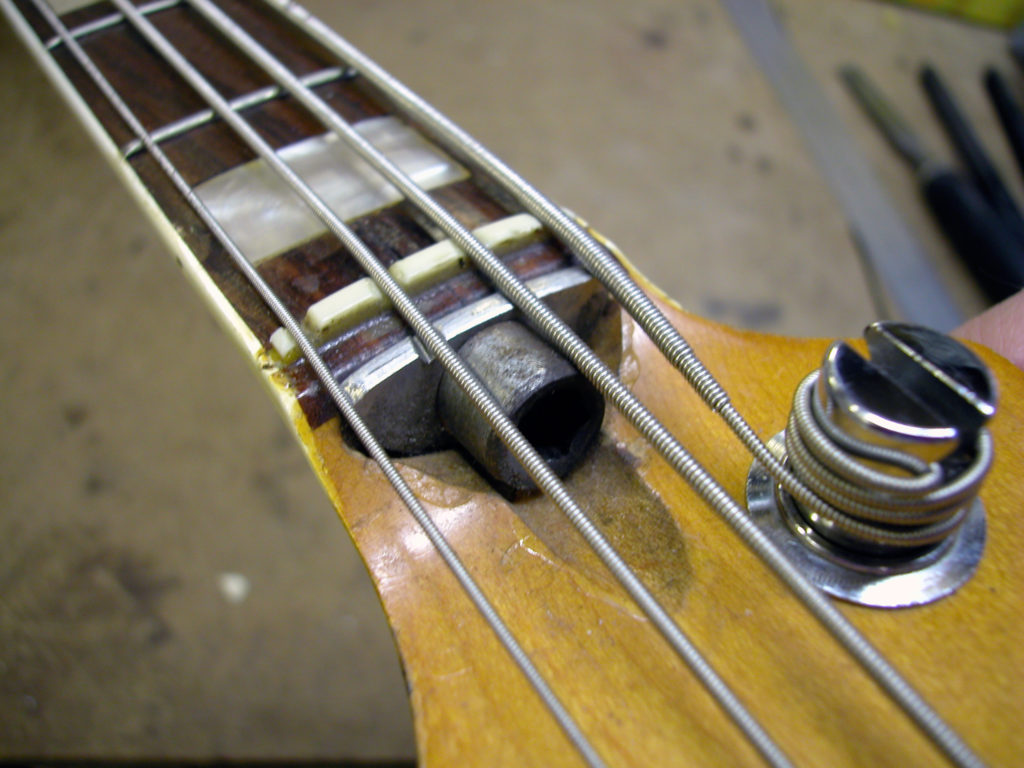 Questo strumento ci è pervenuto in laboratorio in una condizione che non ci era mai capitata: aveva al posto del nottolino una forcella di ferro inserita in uno scavo in corrispondenza del nut e un bullone che serviva per tirare il manico, che anch’esso aveva dei problemi. Questo Jazz era insuonabile perché aveva un action altissima!