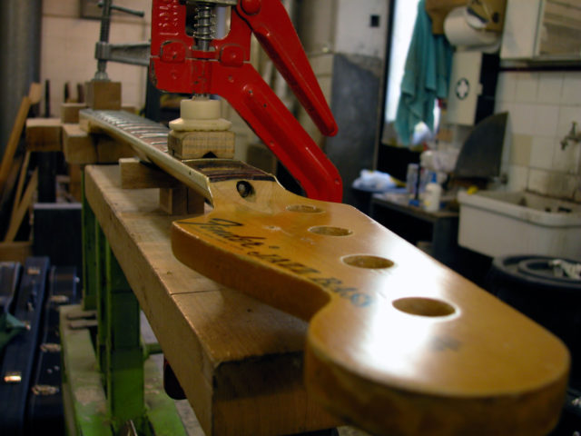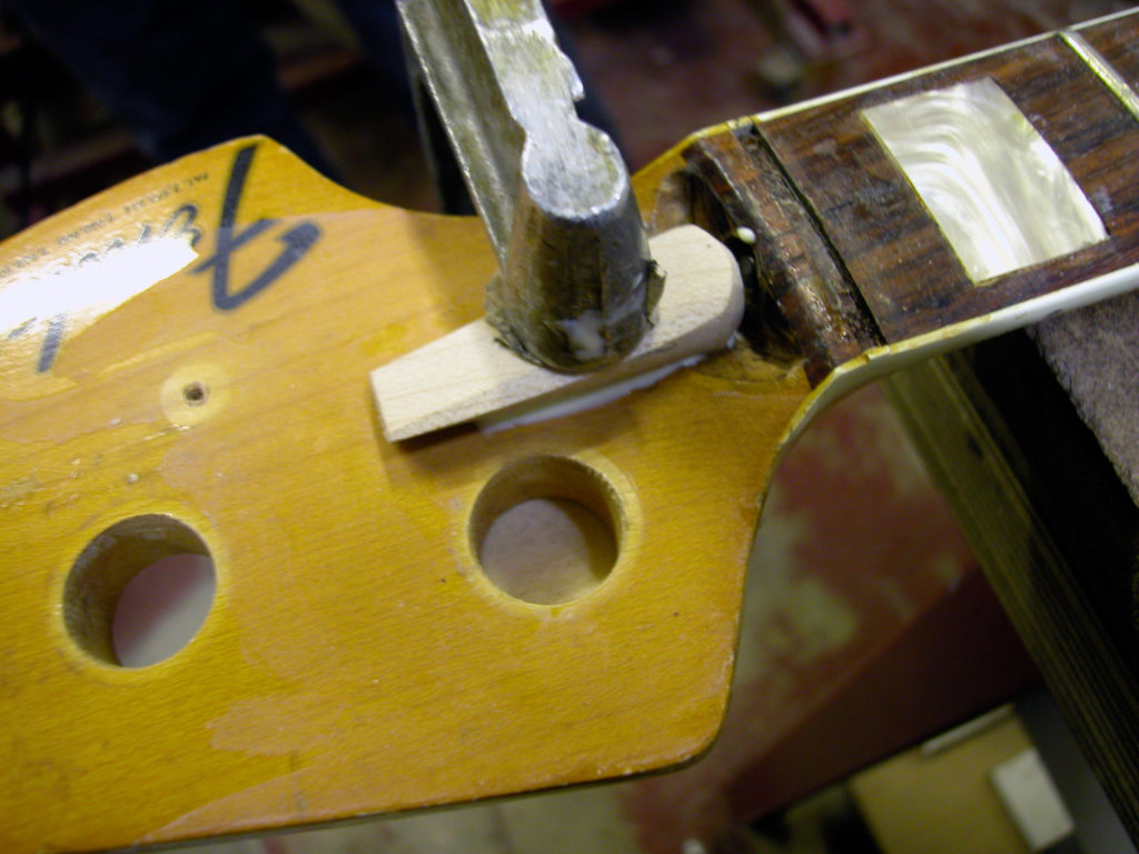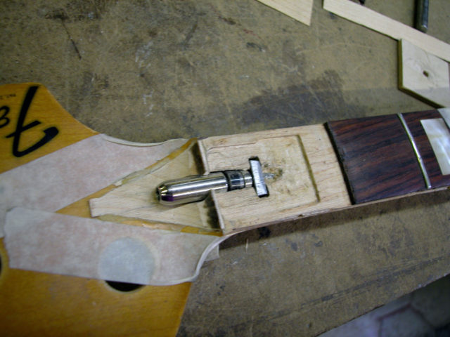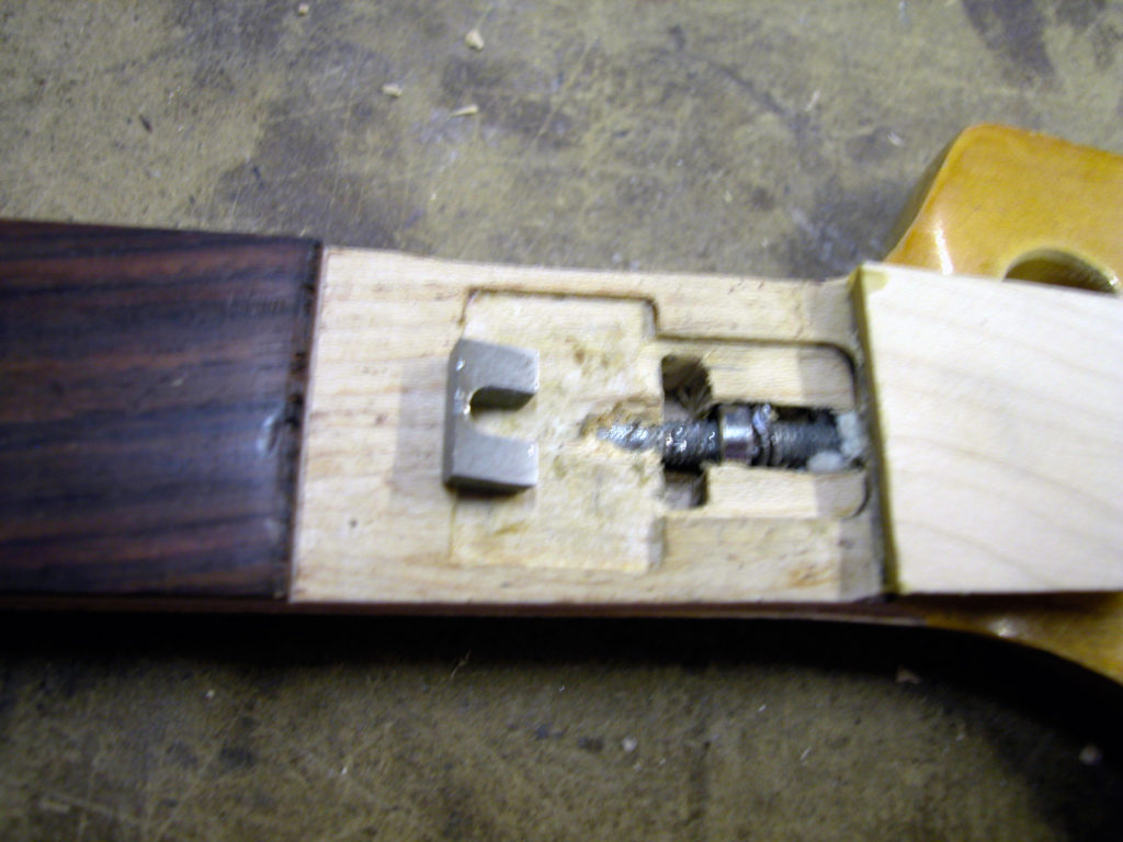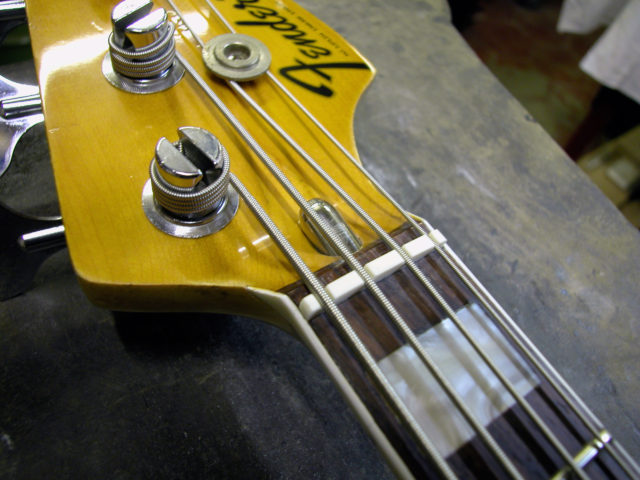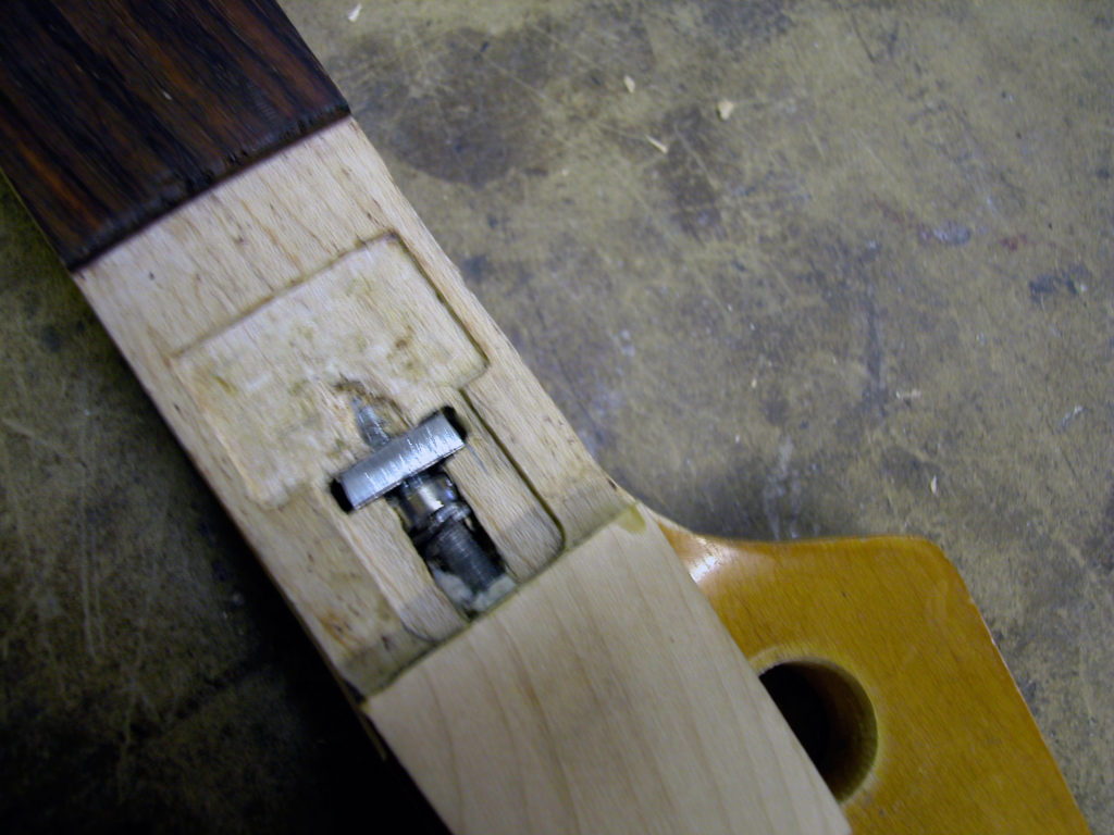 Questo strumento ci è pervenuto in laboratorio in una condizione che non ci era mai capitata: aveva al posto del nottolino una forcella di ferro inserita in uno scavo in corrispondenza del nut e un bullone che serviva per tirare il manico, che anch’esso aveva dei problemi. Questo Jazz era insuonabile perché aveva un action altissima!