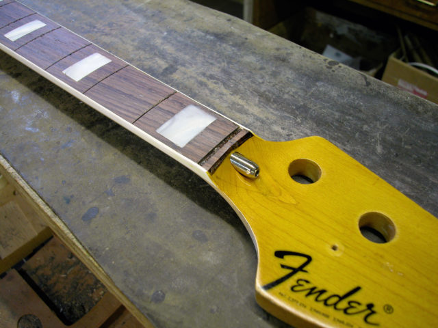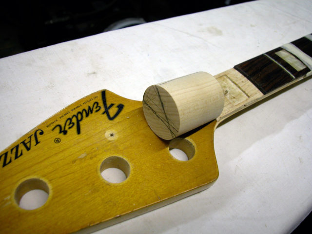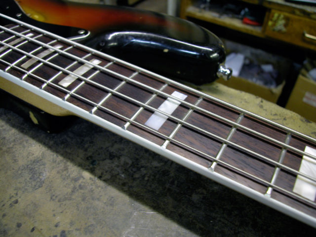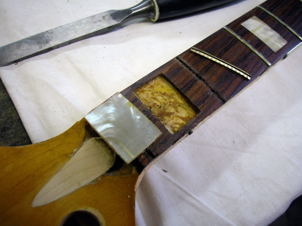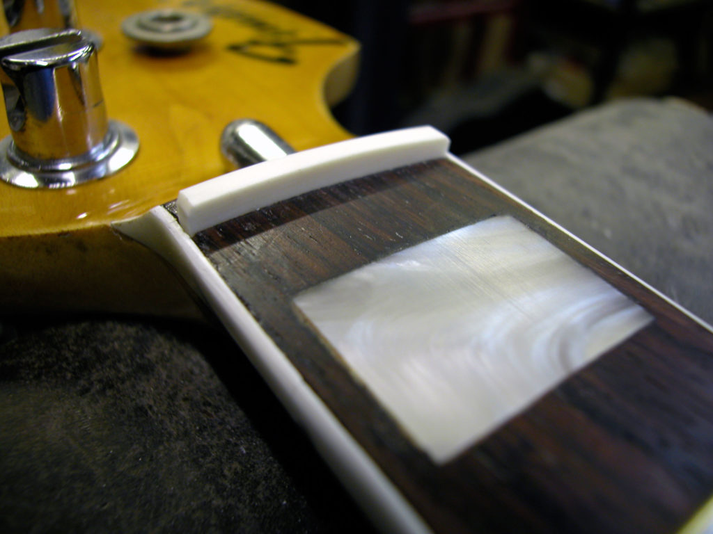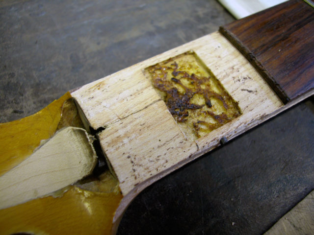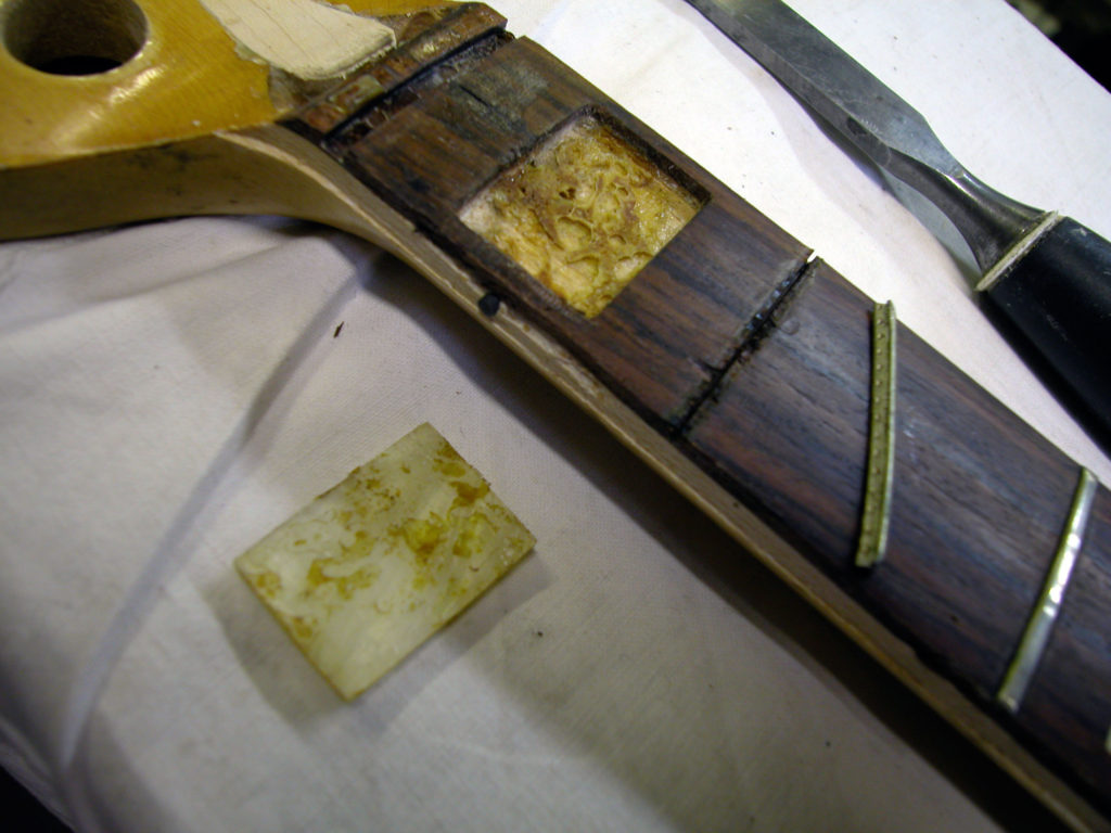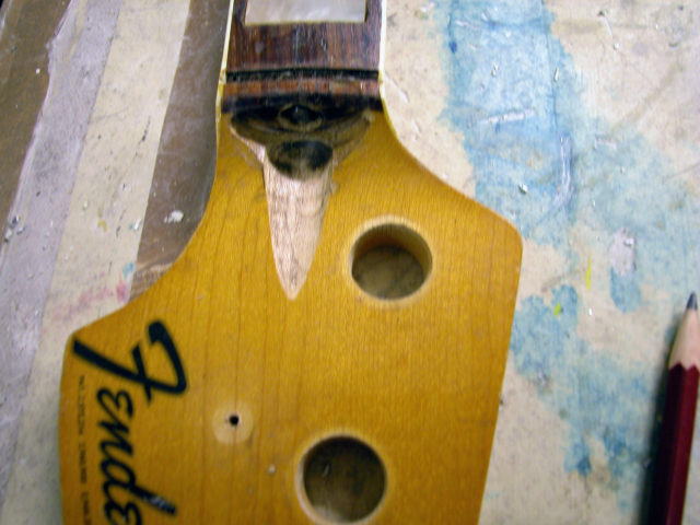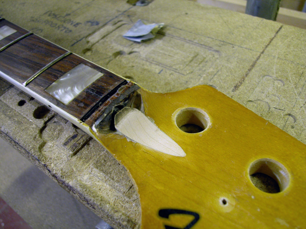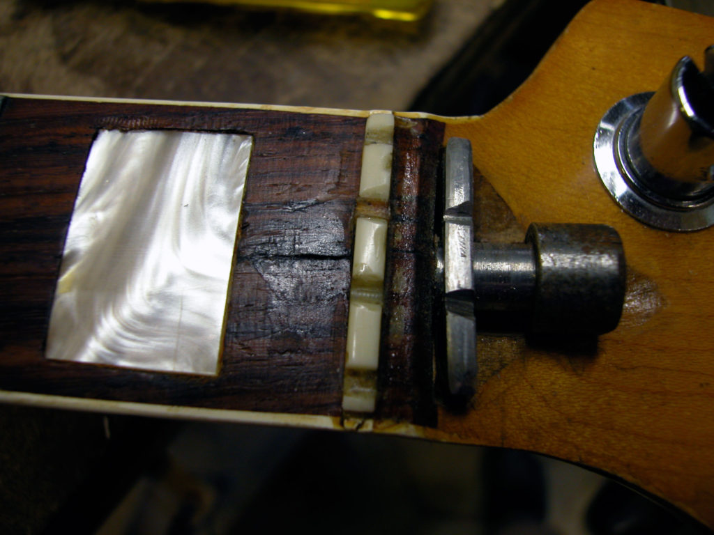 Nel frattempo il problema non si fermava lì, poiché bisognava anche riparare lo sfondamento provocato dal nottolino in corrispondenza del primo tasto. Questo problema è molto frequente nei manici dei Jazz Bass in quanto essendo sottili e magari storti si forza il truss road fino a spaccare il legno sotto il nut. Siamo stati quindi costretti a rimuovere il primo riferimento in madreperla nonché il primo pezzo di tastiera in palissandro e parte del binding.