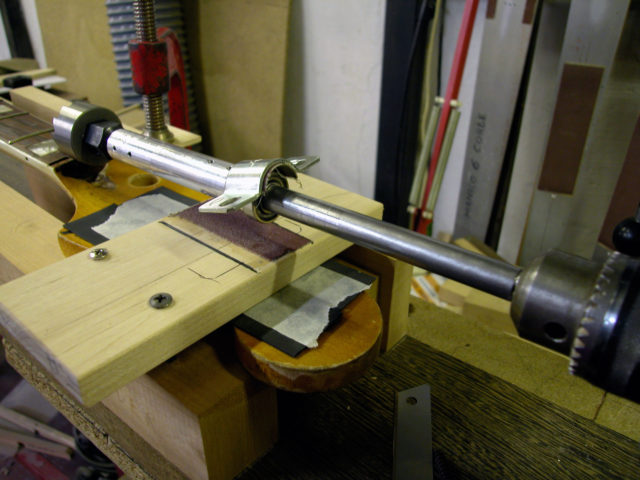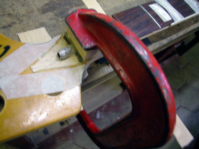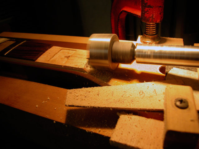Dopo avere spianato e rimodellato il famoso tondo di acero siamo passati alla realizzazione dell’alloggiamento per il nottolino. Eravamo a metà dell’opera, ma bisognava ancora ricondizionare la sede dell’intarsio del primo tasto e richiudere il tutto con la parte della tastiera e il binding che erano stati accuratamente rimossi.