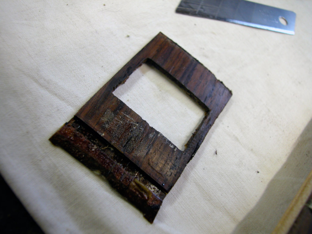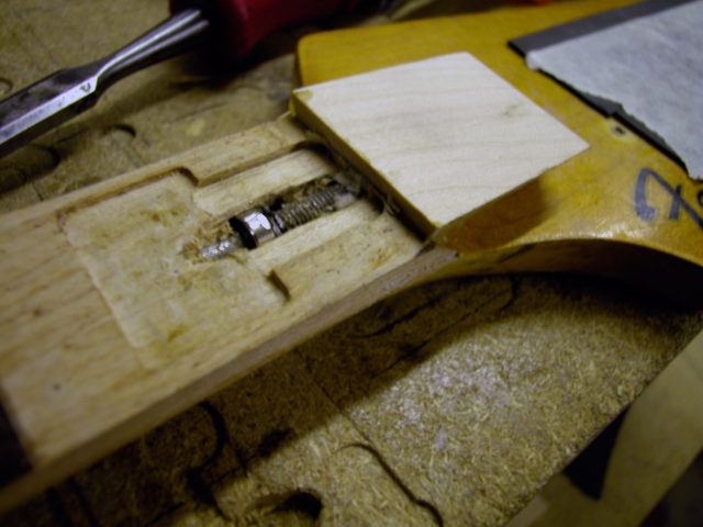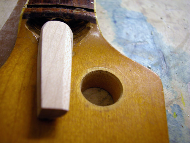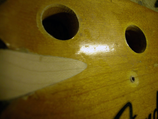 Siccome il danno provocato presentava due diversi incavi, bisognava intervenire con due inserti diversi. Il primo si rivelò abbastanza semplice poiché si trattava di incollare un tondino di acero nel primo avvallamento dopo averlo accuratamanete pulito.