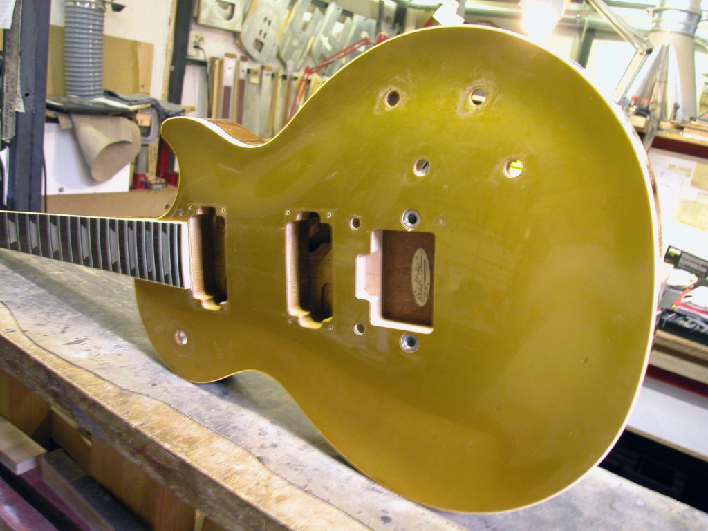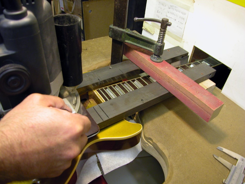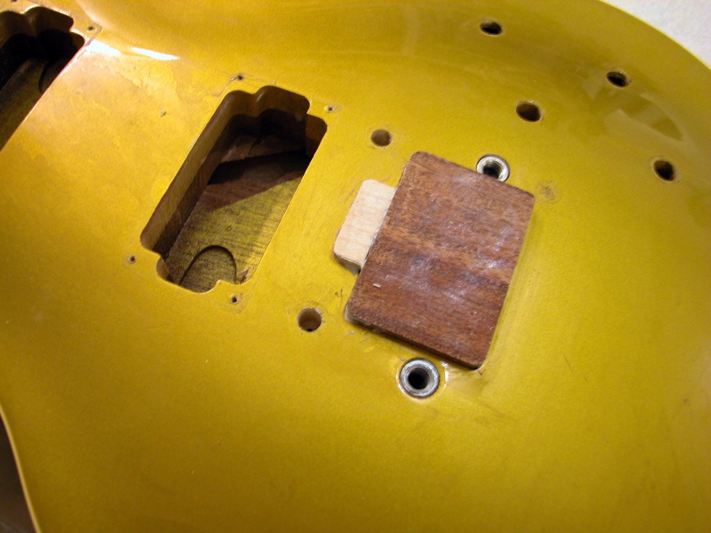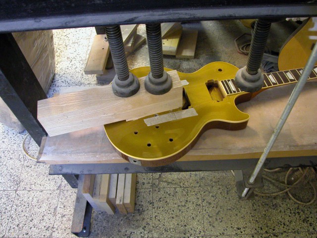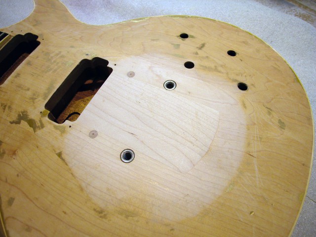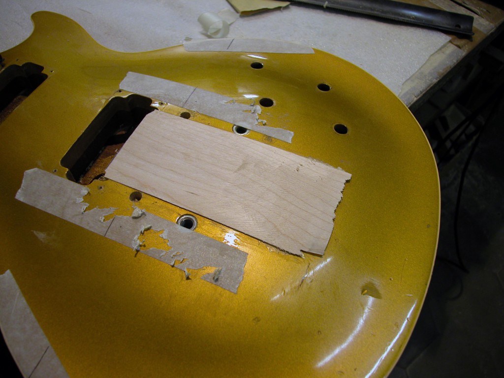 Abbiamo realizzato un tassello di mogano della misura esatta del foro. Dopo averlo incollato siamo stati costretti a fresare una striscia di materiale per poter incollare (per venatura) un pezzo lungo di acero, in modo da coprire perfettamente il foro ed evitare in seguito, qualsiasi tipo di marcatura.