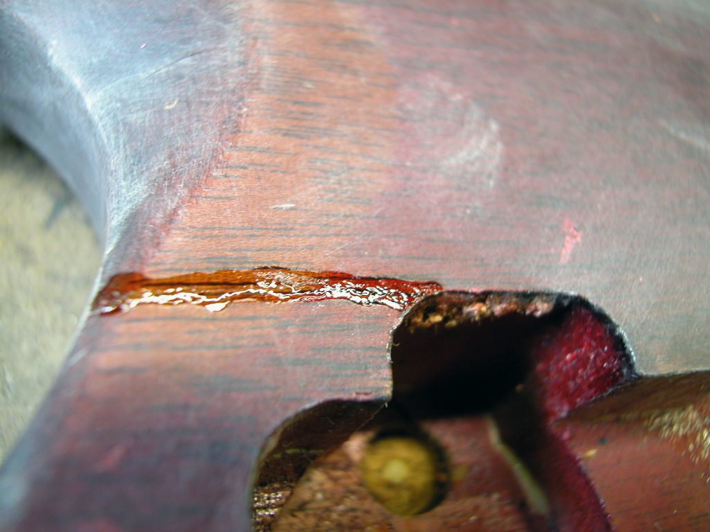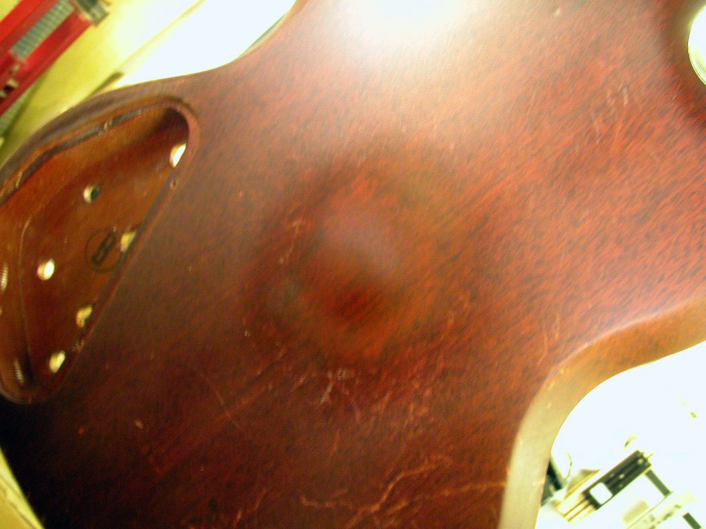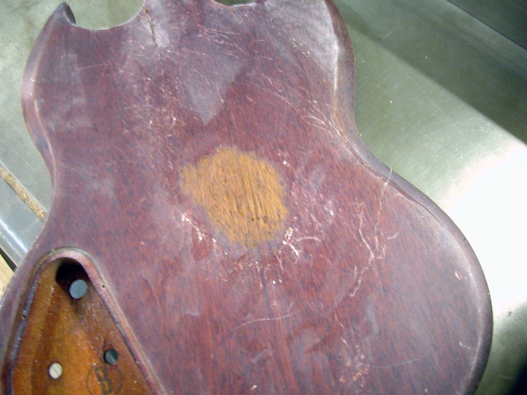 Il cliente ci ha chiesto di intervenire oltre al risanamento del manico anche sulla rifinitura, ma in modo non invasivo, di modo da non compromettere troppo l’originalità del colore e lasciare qua e là qualche segno del suo percorso di vita.