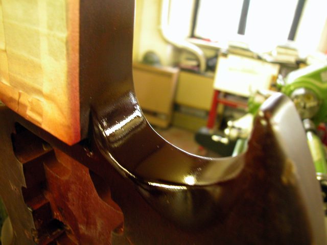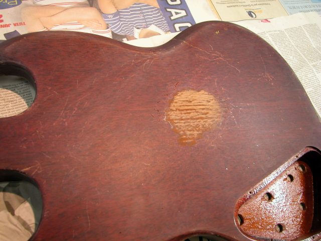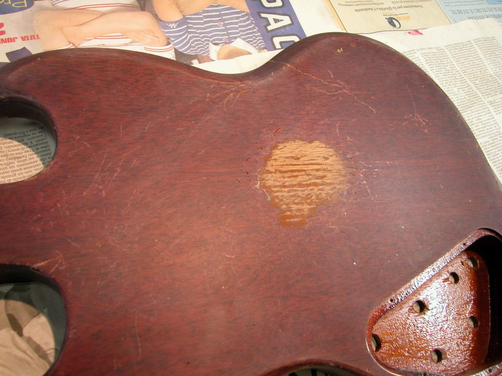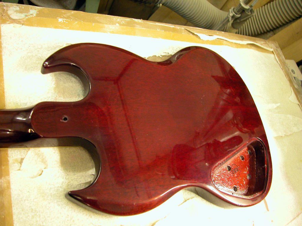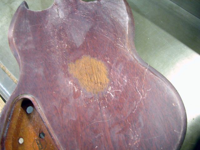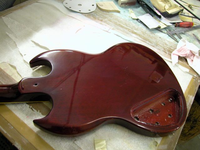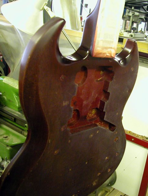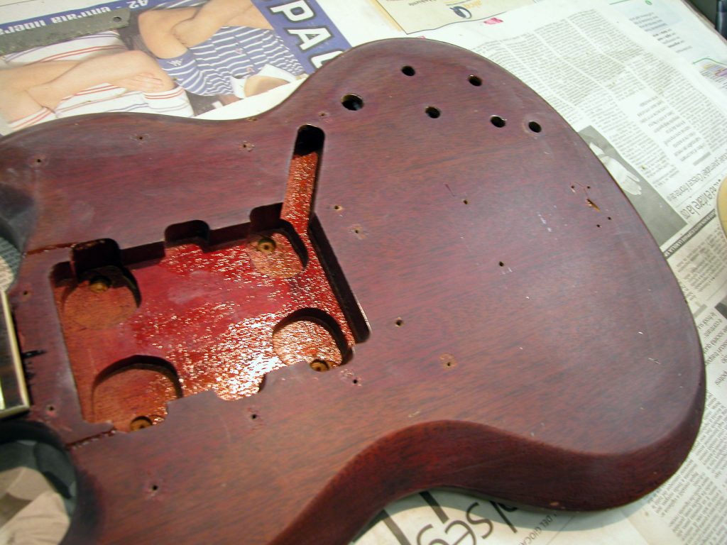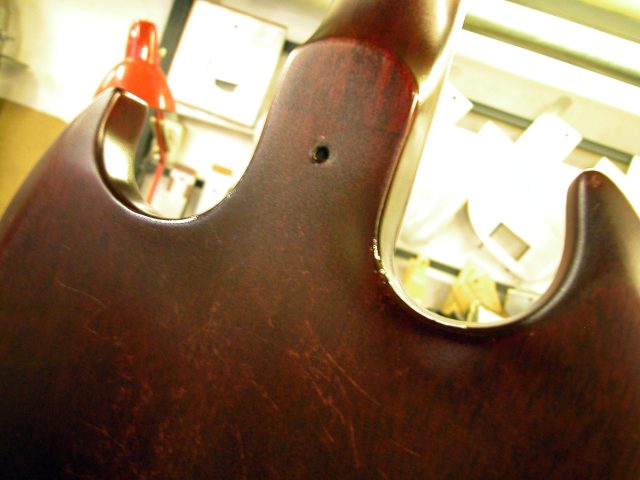 1. Una volta riconsolidata la giunzione corpo/manico si è passati alla fase di ritocchi vari sullo strumento.