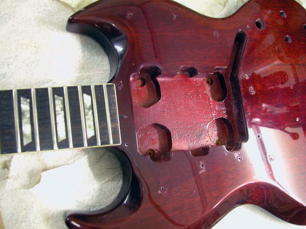 La colorazione del fronte del body appare di due tonalità diverse. Quella parte nascosta dal battipenna e dall’attacco del vibrato è più rossa poiché non prendendo luce non si è sbiadita come in foto.