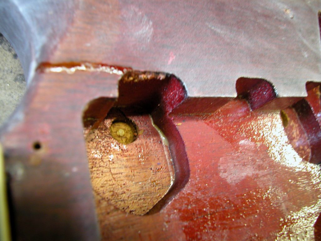 Per coprire questa grossa scrostatura abbiamo dovuto riprodurre meticolosamente le varie fasi di verniciatura partendo dal fondo dalla colorazione rossa/trasparente e dal lucido coprente. Occorreva anche mascherare bene la vernice crepata provocata dalla rottura.
