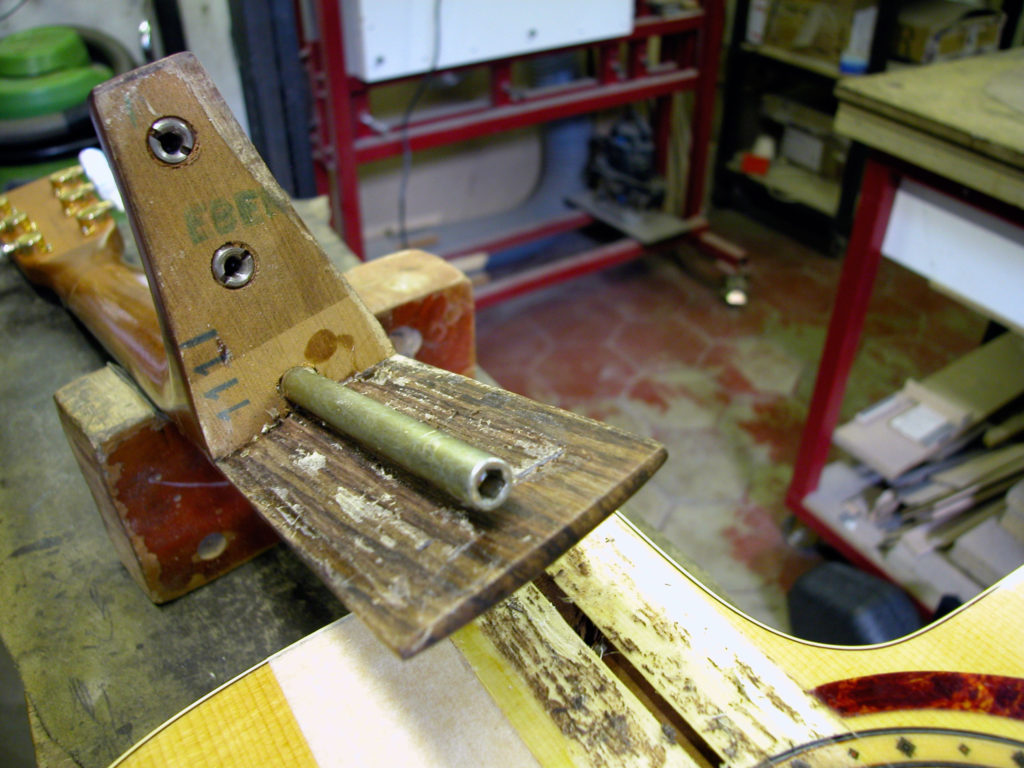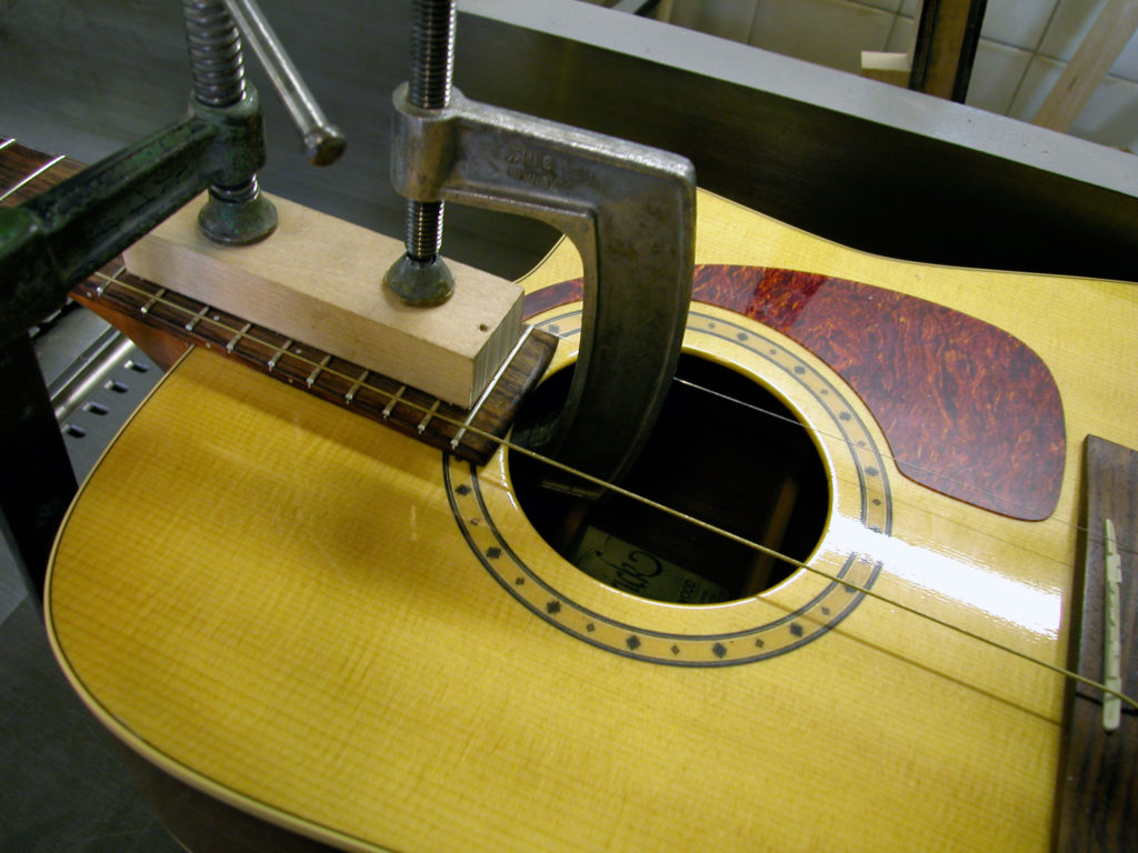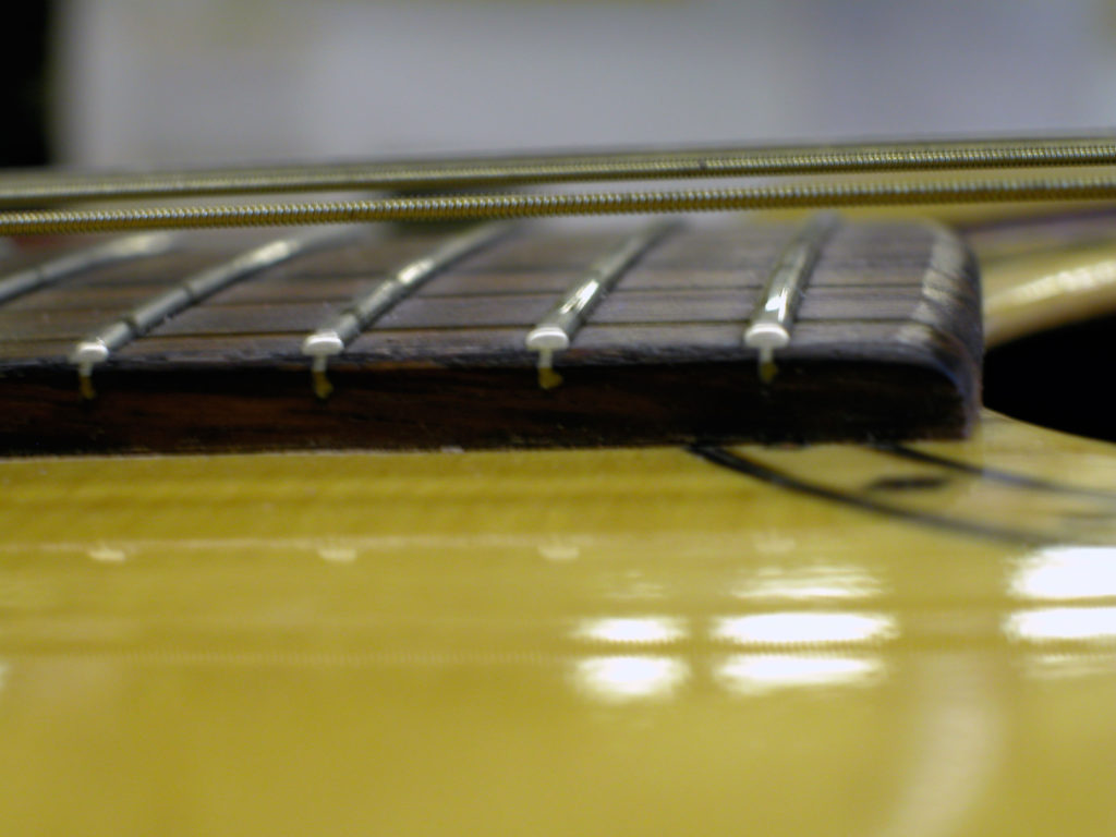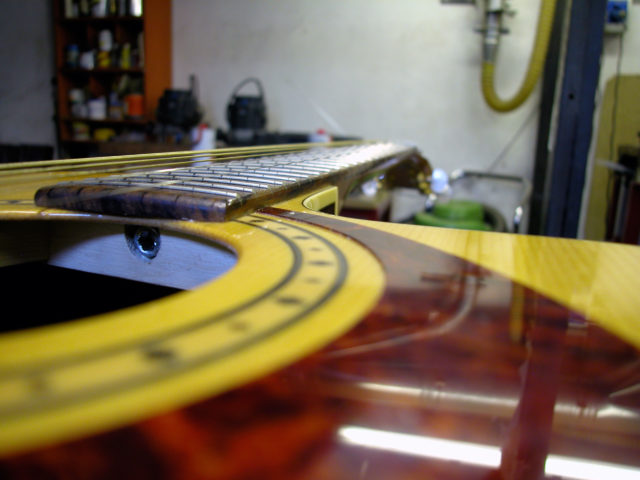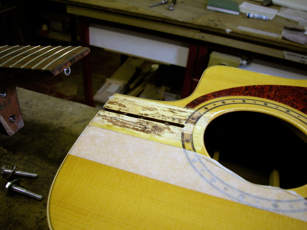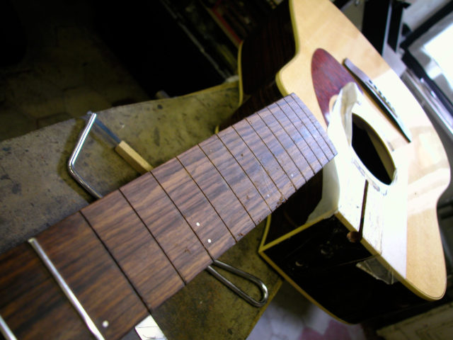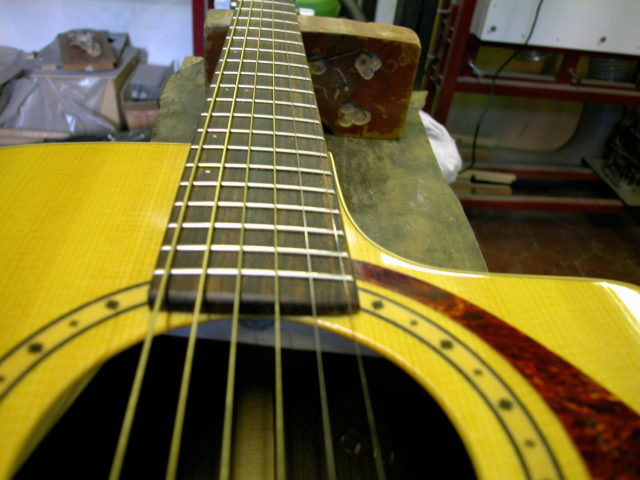 Questa bella chitarra acustica, nonostante la sua sonorità di notevole qualità, aveva il problema delle corde troppo alte dovute ad un ingobbamento della tastiera in corrispondenza dello zoccolo e oltretutto presentava un’inclinazione eccessiva tale da non poter abbassare l’action limando semplicemente il ponticello.
