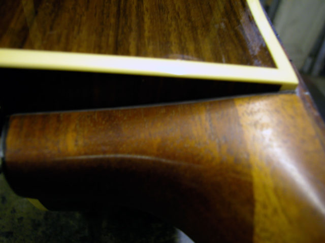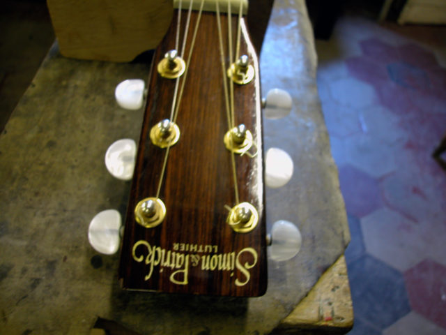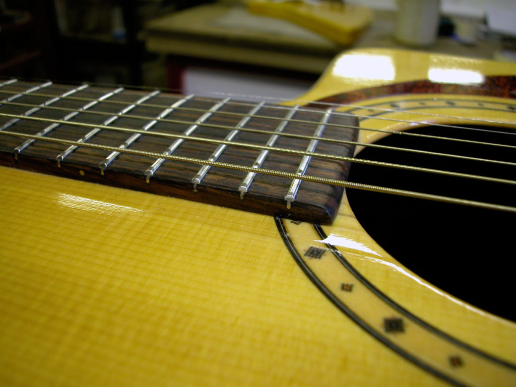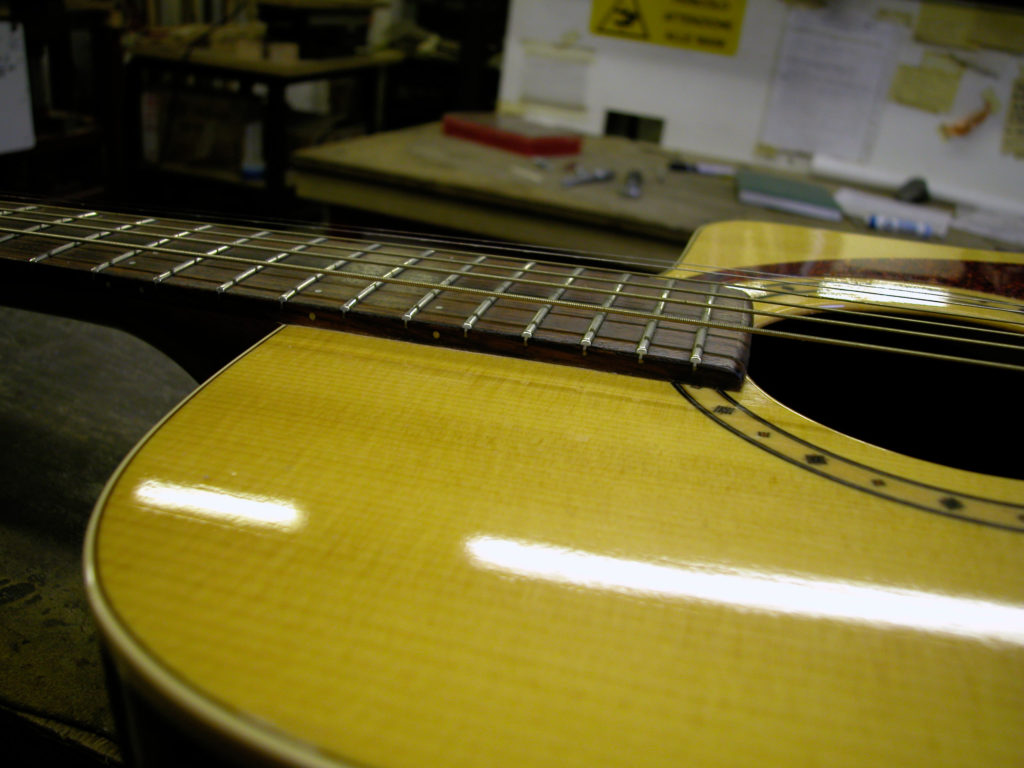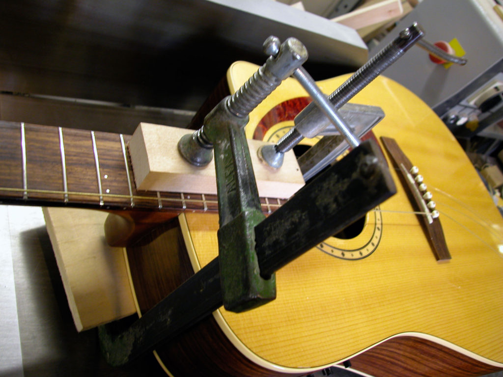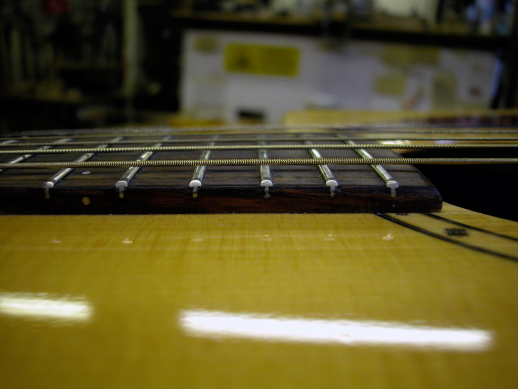 Questa bella chitarra acustica, nonostante la sua sonorità di notevole qualità, aveva il problema delle corde troppo alte dovute ad un ingobbamento della tastiera in corrispondenza dello zoccolo e oltretutto presentava un’inclinazione eccessiva tale da non poter abbassare l’action limando semplicemente il ponticello.