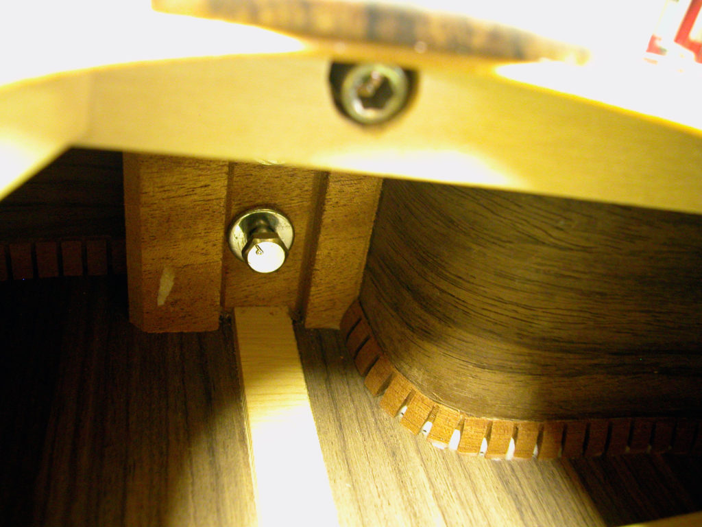 Occorreva lavorare sul manico che, per fortuna in questo strumento, oltre che essere incollato nella parte tavola-tastiera era anche abbullonato nell’interno in corrispondenza del tacco.