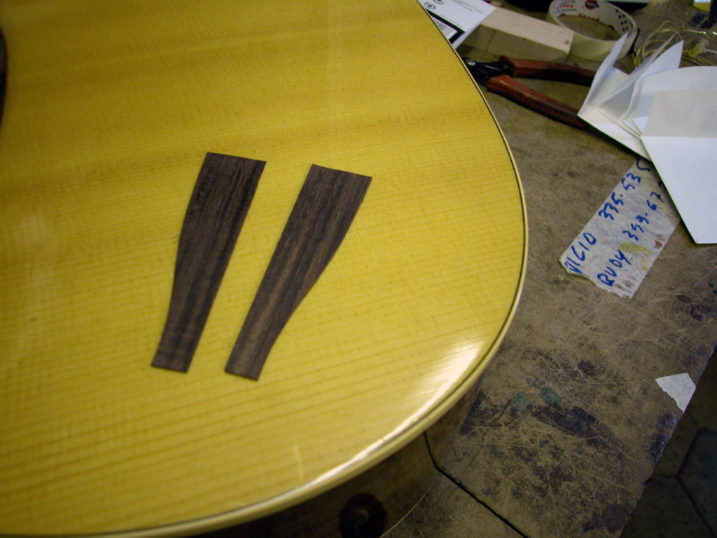 Dopo aver ritastato la tastiera si è reso necessario risolvere il problema dell’inclinazione prima di reinserire il manico nella sua sede. Per fare questo abbiamo realizzato due spessorini di legno rastremati ed incollati ai lati della superficie combaciante con la fascia del corpo.