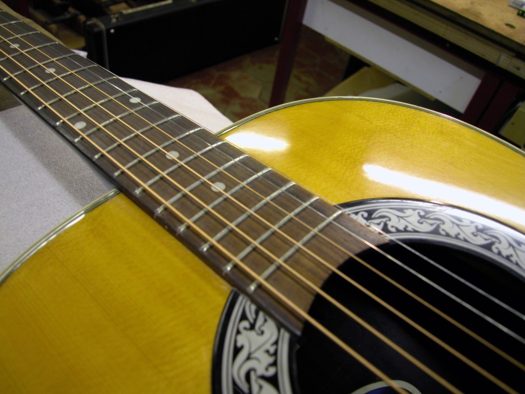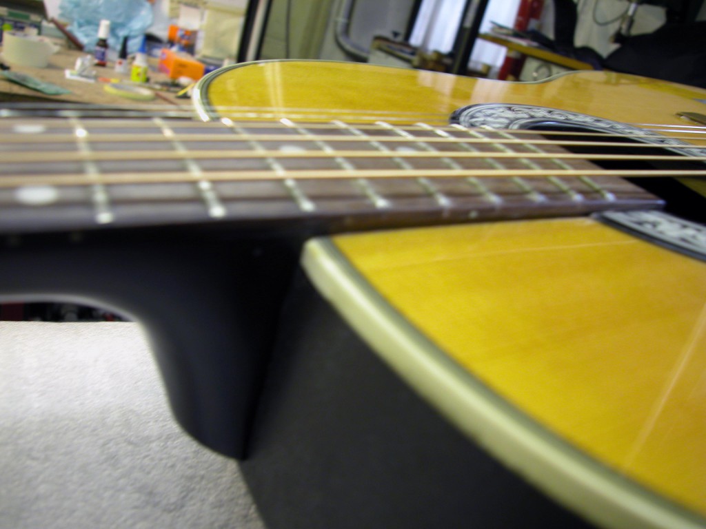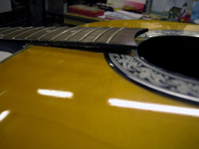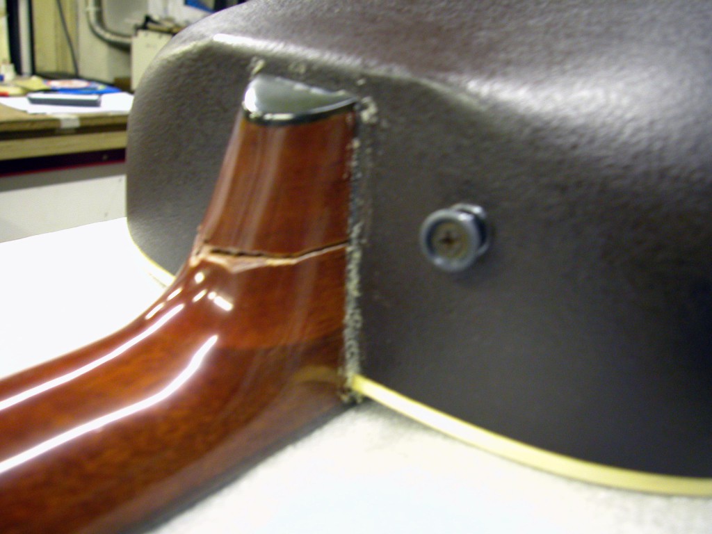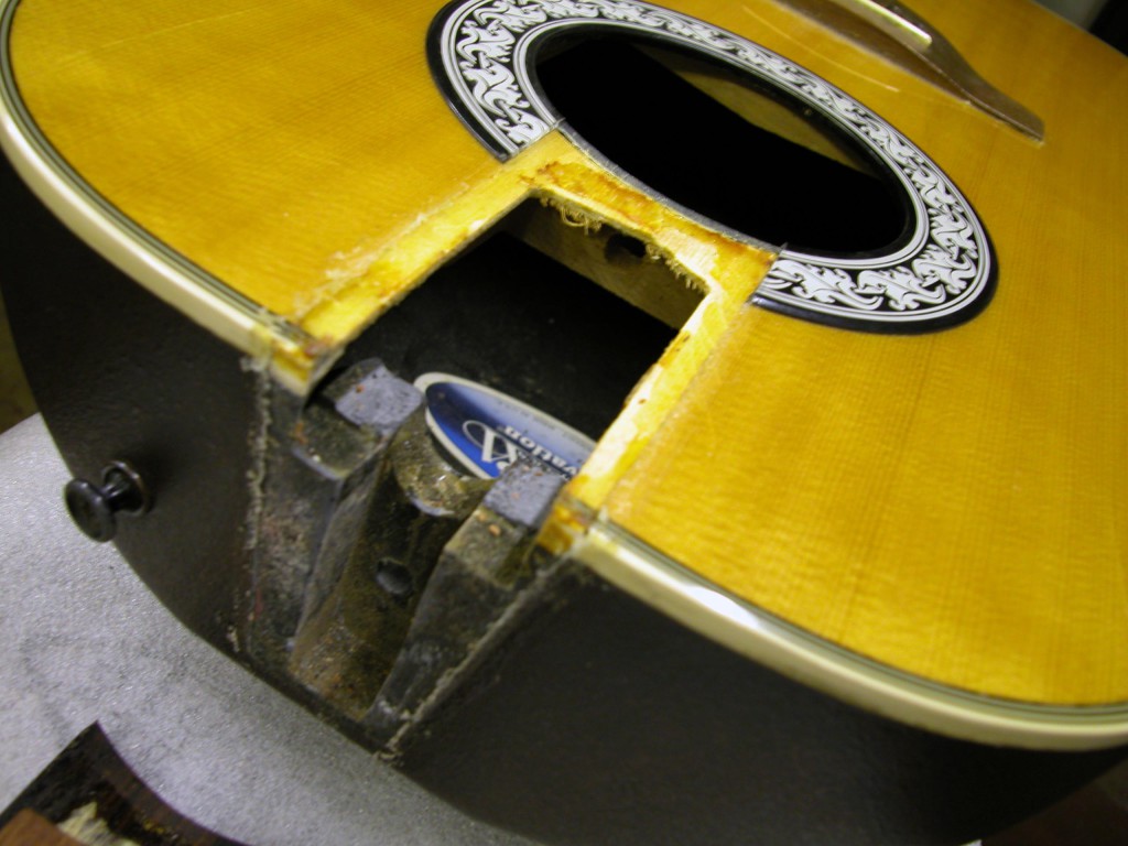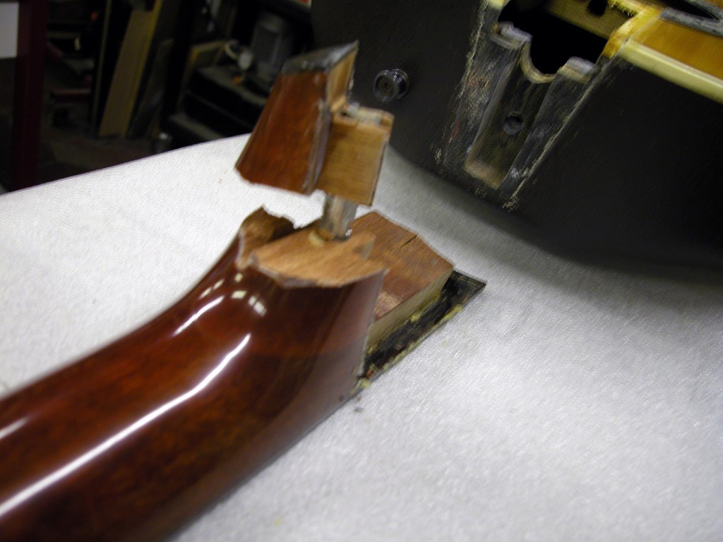 After a classic breakage caused by a person that used the guitar to sit on it (obviously not on purpose) instead of a chair,the instrument showed various breakages:the first one at the wedge of the neck,the second at the separation of the fretboard on the soundbox,and the third,the worst, was on the inside, in the joint hosting the pawl for the screwing of the neck,since this model is glued and also screwed by two bolts.