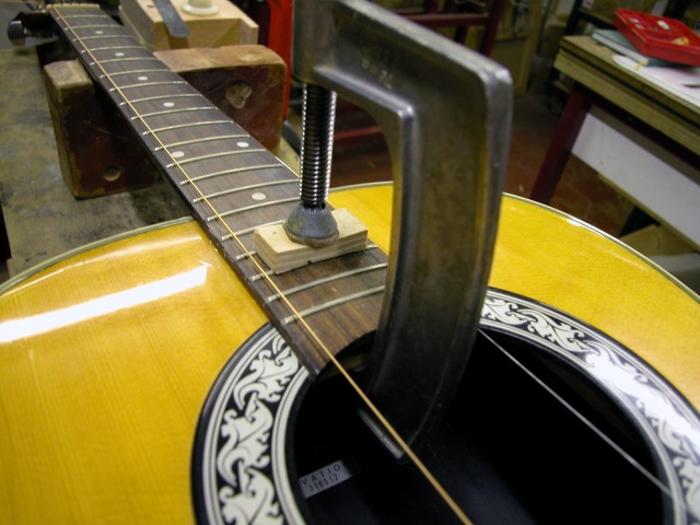 In the later phase body and neck were glued,both by screwing the two bolts inside the soundbox,which enter directly in the pawl put in the wedge, and by a clamp that pushes the fretboard against the soundbox.