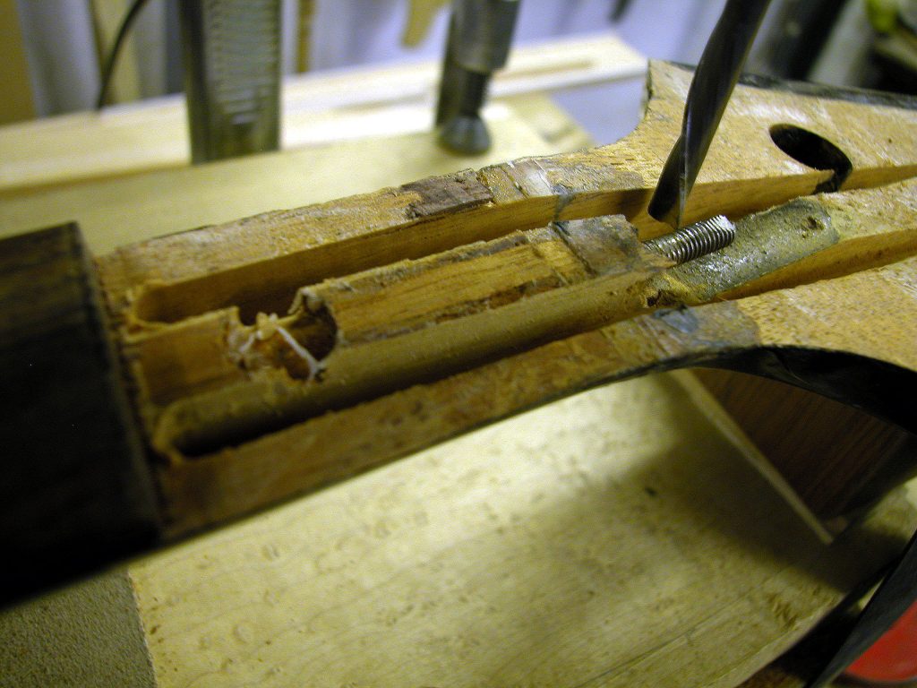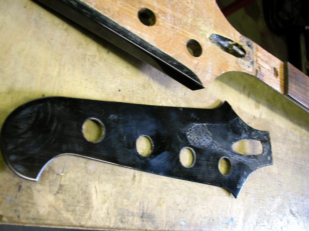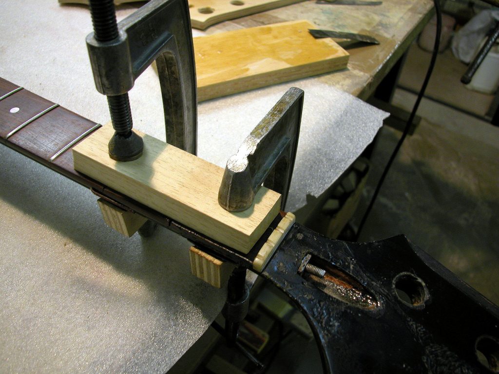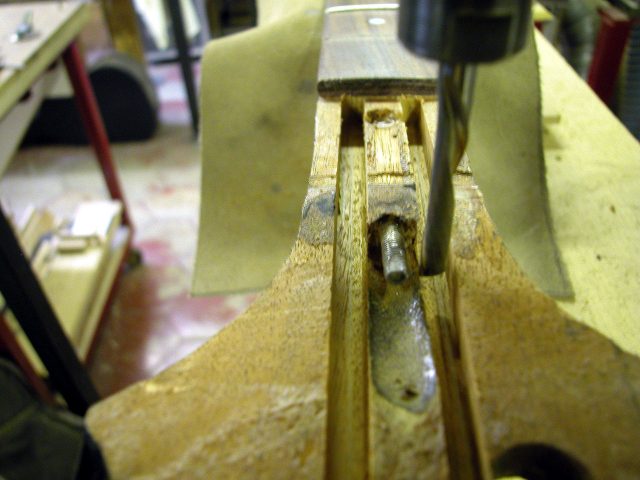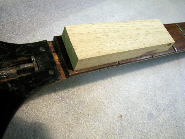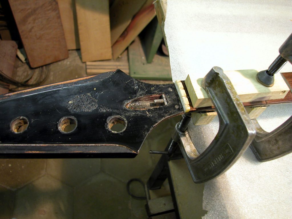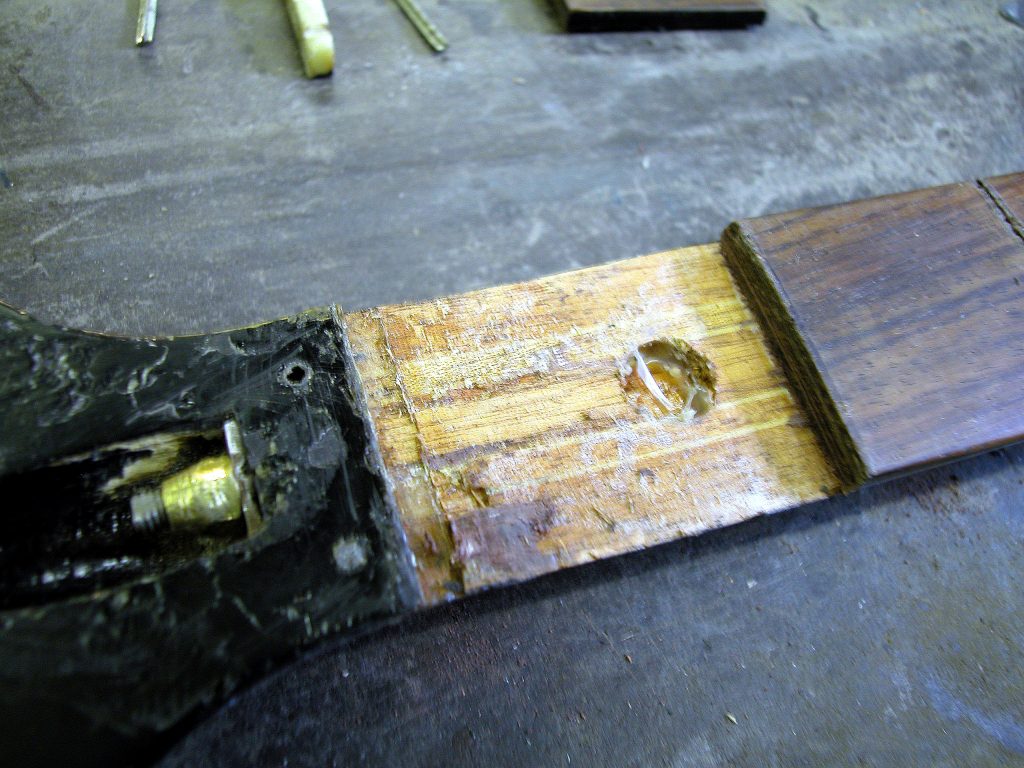 Per ottenere un risultato soddisfacente, dopo aver rincollato la paletta, abbiamo rimosso il primo pezzo di tastiera, ed introdotto due inserti di legno.