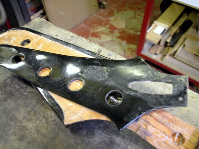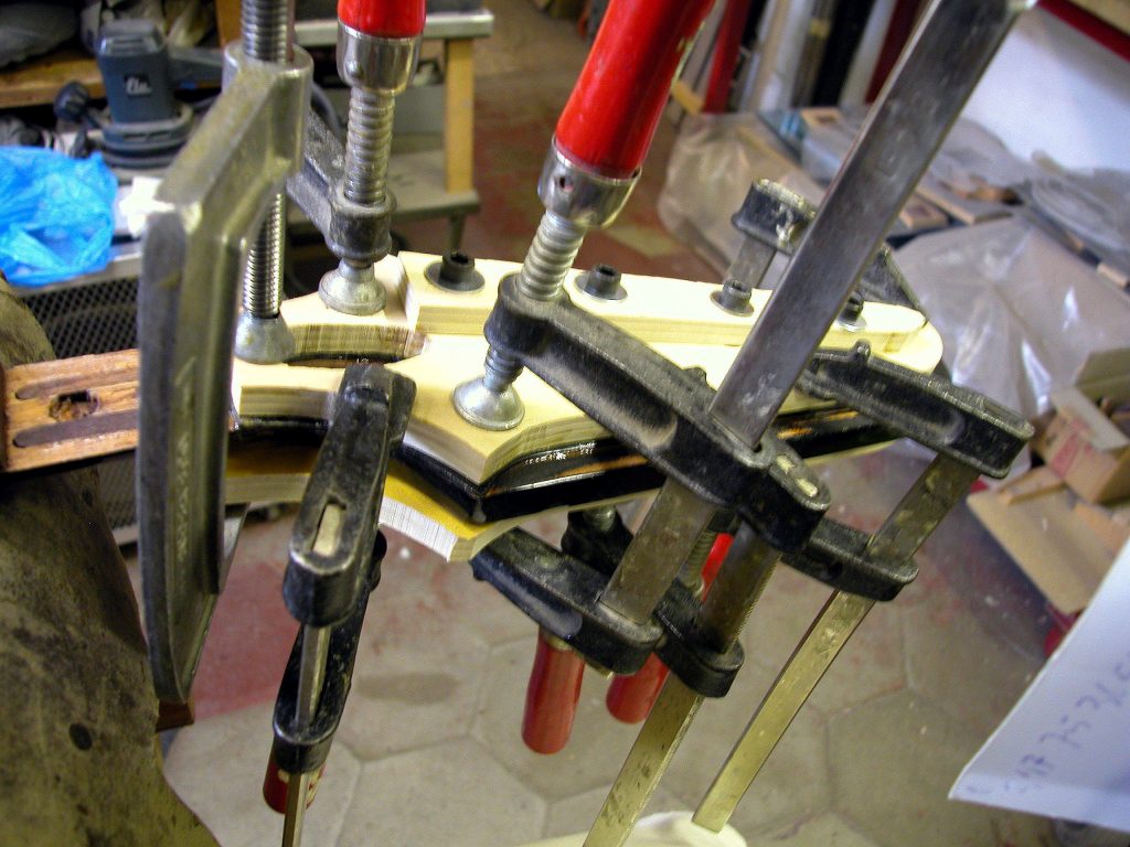 Questi sono stati sistemati a cavallo tra manico e paletta per unire ed irrobustire la parte lesa. Ovviamente, a lavoro concluso, essi non dovevano vedersi e poiché dalla parte posteriore non vi era sufficiente spazio, abbiamo deciso di inserirli dalla parte frontale.