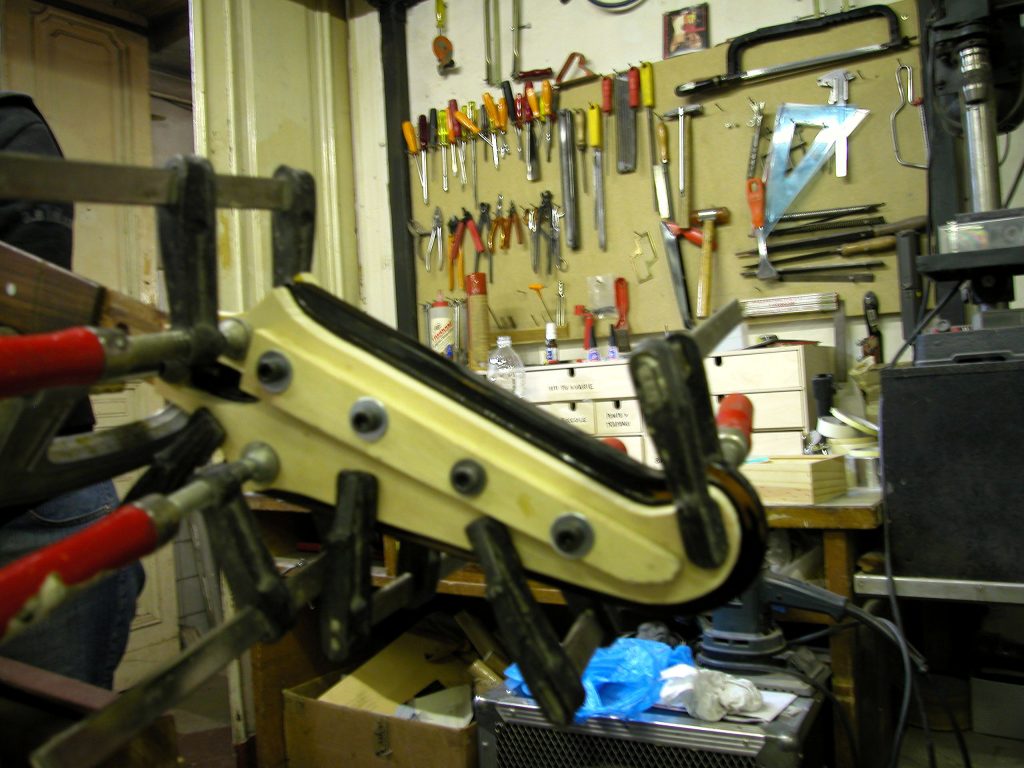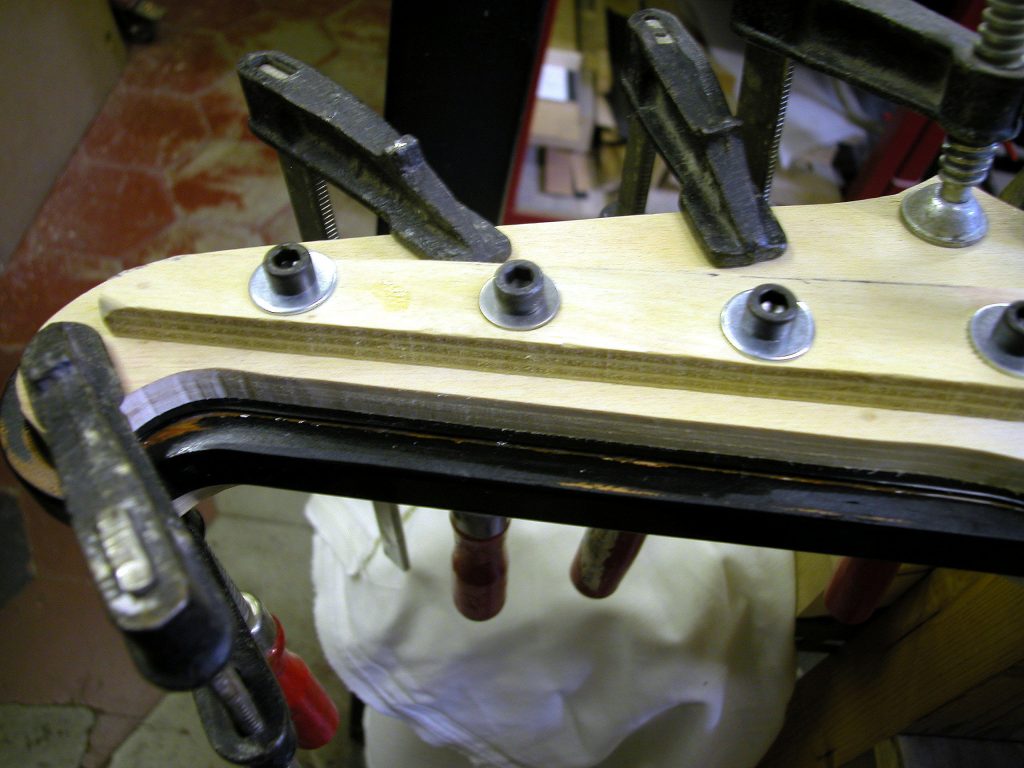 Di conseguenza, dopo avere accuratamente rispianato le superfici, siamo passati al riposizionamento ed incollaggio della parte frontale della paletta e del primo pezzo di tastiera che avevamo precedentemente rimosso.
