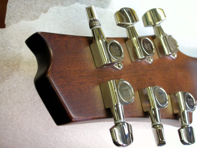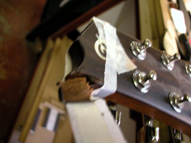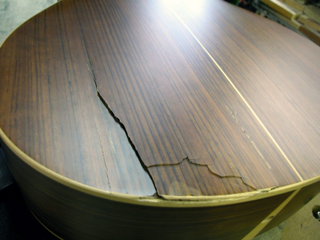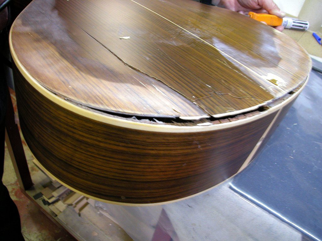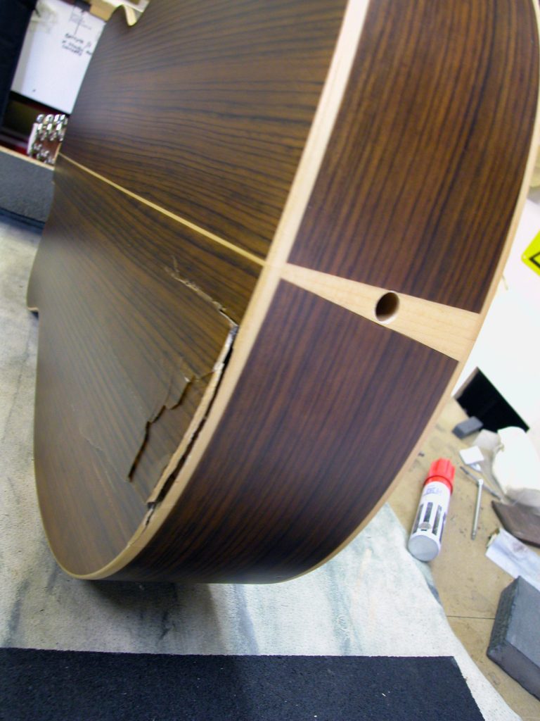 In seguito ad una brutta caduta la chitarra in questione presentava il corpo con il fondo completamente rotto in modo scomposto e con le catene staccate.