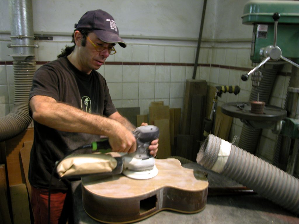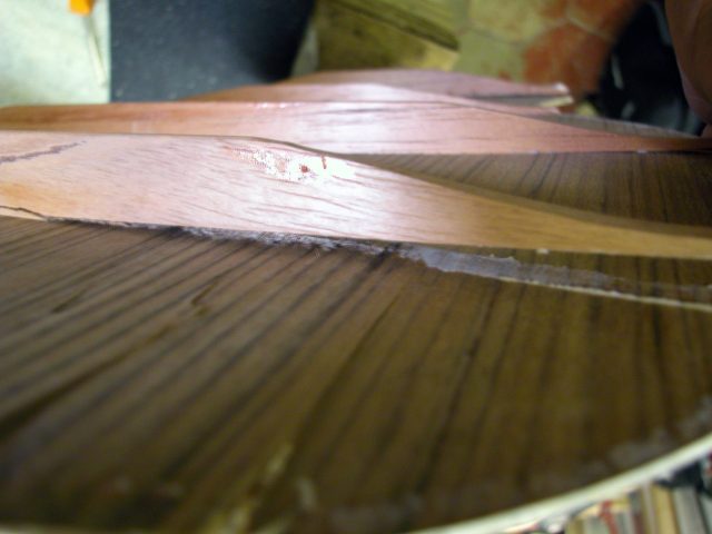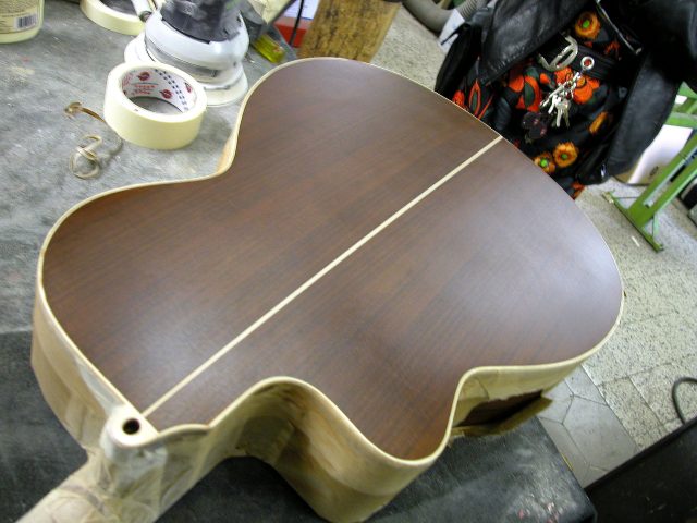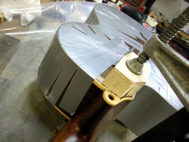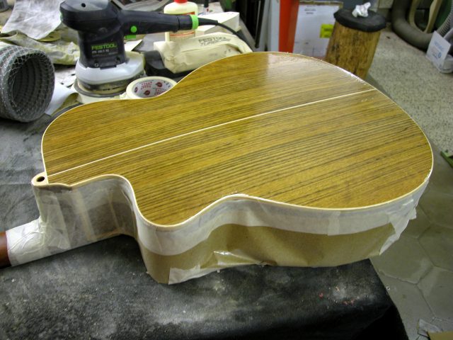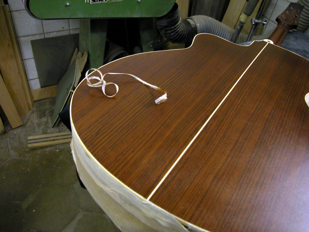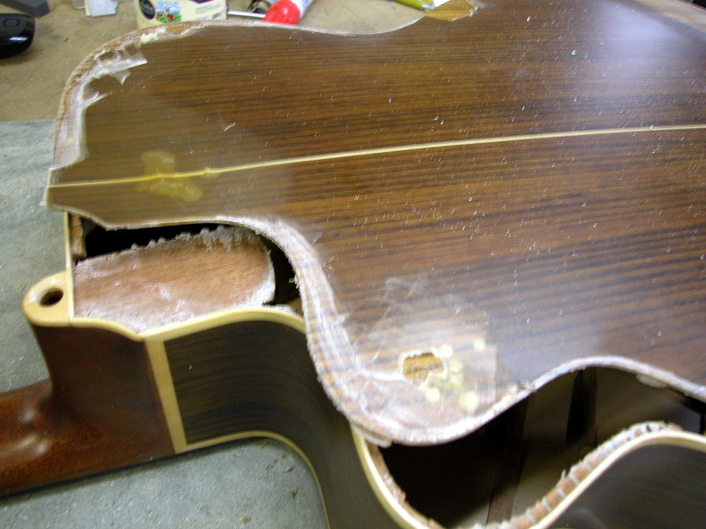 Per ripristinare il fondo occorreva scollarlo correttamente ed interamente dalle fasce laterali, nonché dallo zoccolo del manico, senza alterare in nessun modo la sede che lo conteneva. Per eseguire tale operazione eravamo ricorsi all’uso di una fonte di calore in quanto, oltre alla colla chimica, era stato necessario sciogliere la spessa vernice epossidica con cui la chitarra era rifinita.