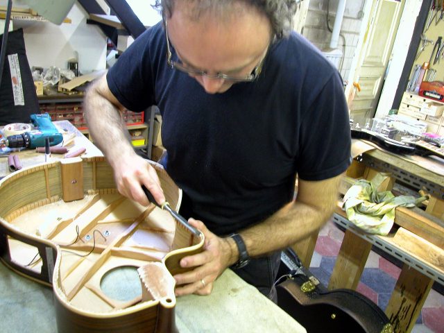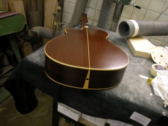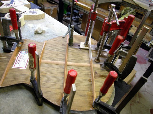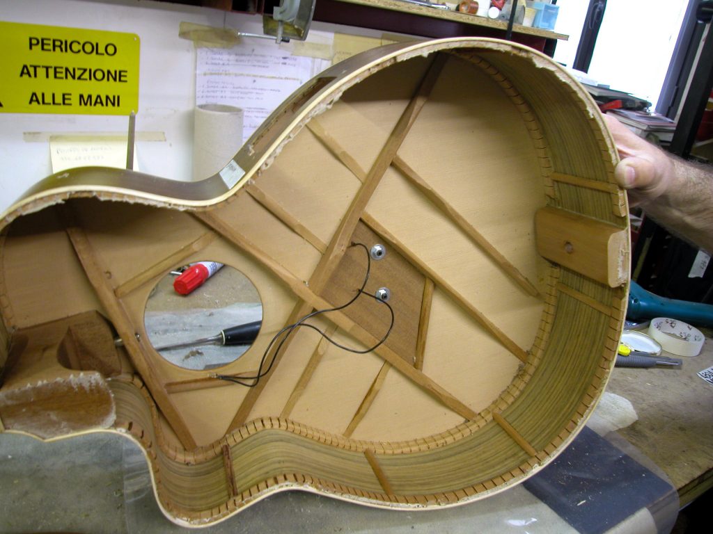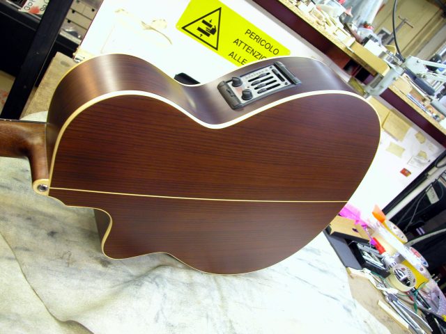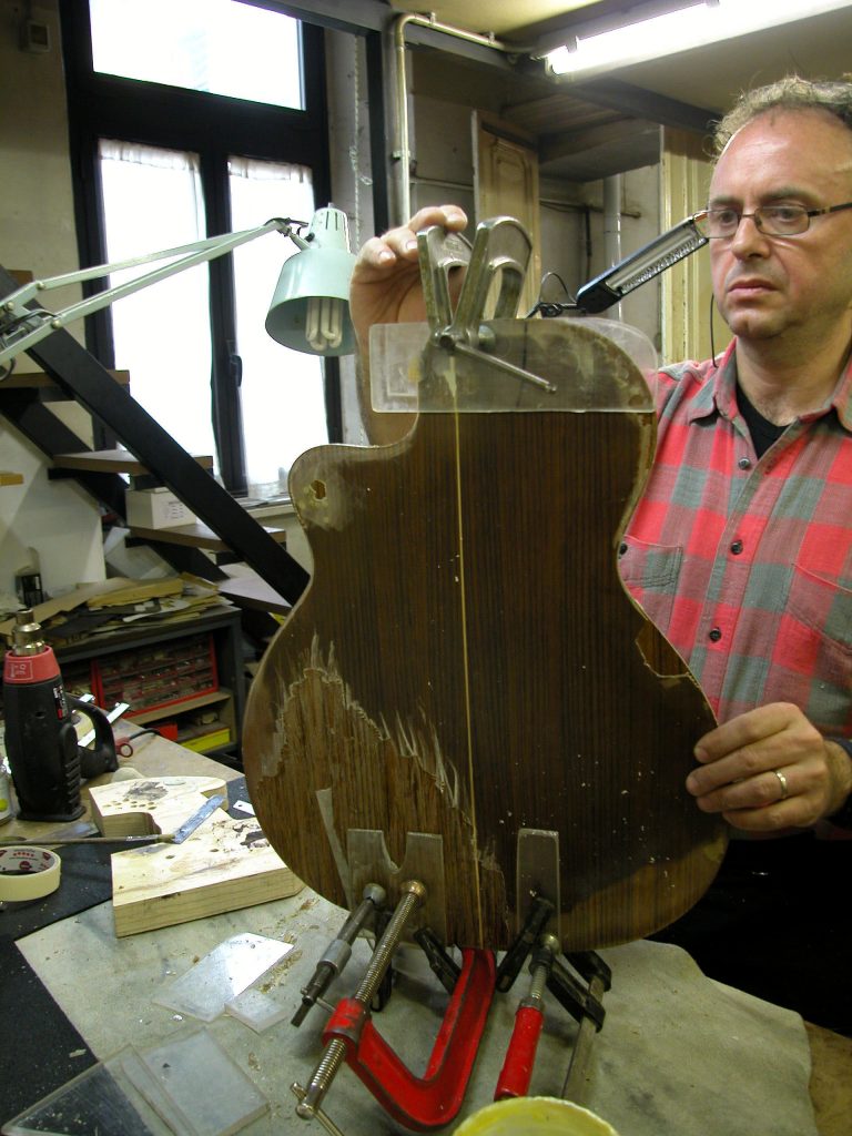 La nostra politica in genere è quella di conservare il più possibile tutte le parti autentiche degli strumenti, per cui, anche in questo caso, avevamo deciso di non sostituire, bensì di riparare il suo fondo originale, per mantenere, di conseguenza, la continuità del tipo di legno impiegato nonché le venature nelle fasce.