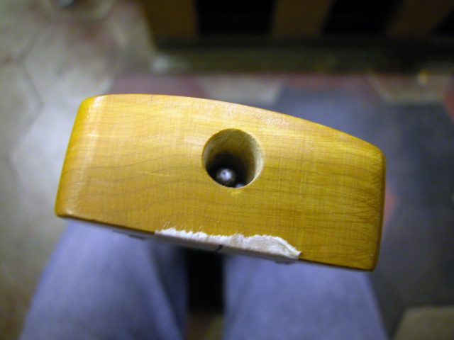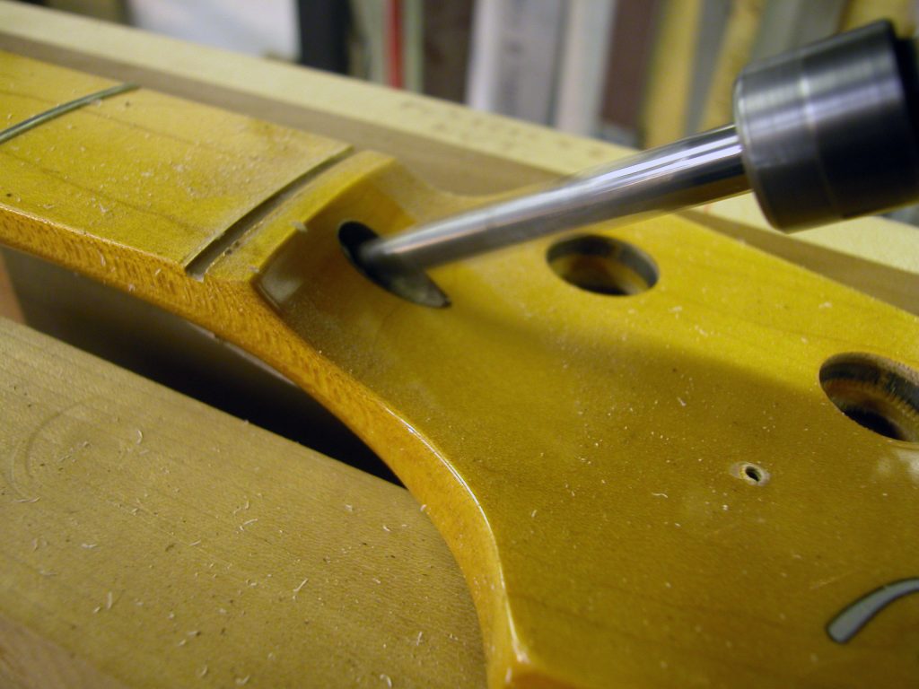 Grosso problema, poiché questo tipo di trussrod è introdotto dalla paletta, passando dietro il manico ed uscendo alla base nell’apposita sede per il notolino.
