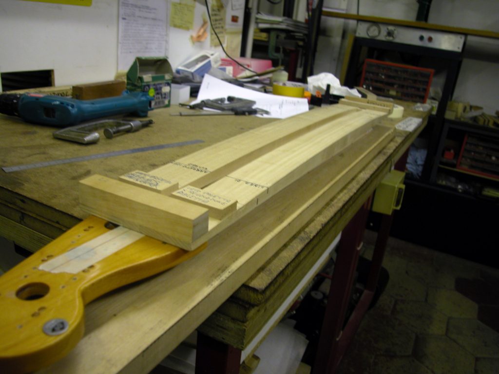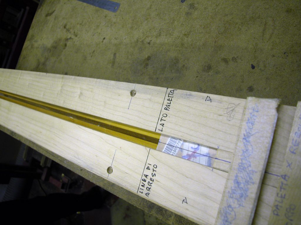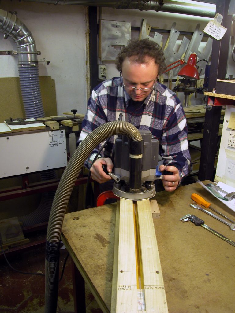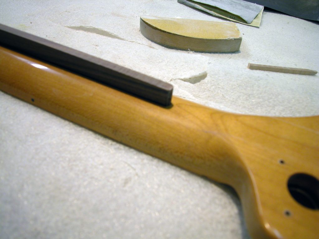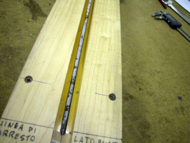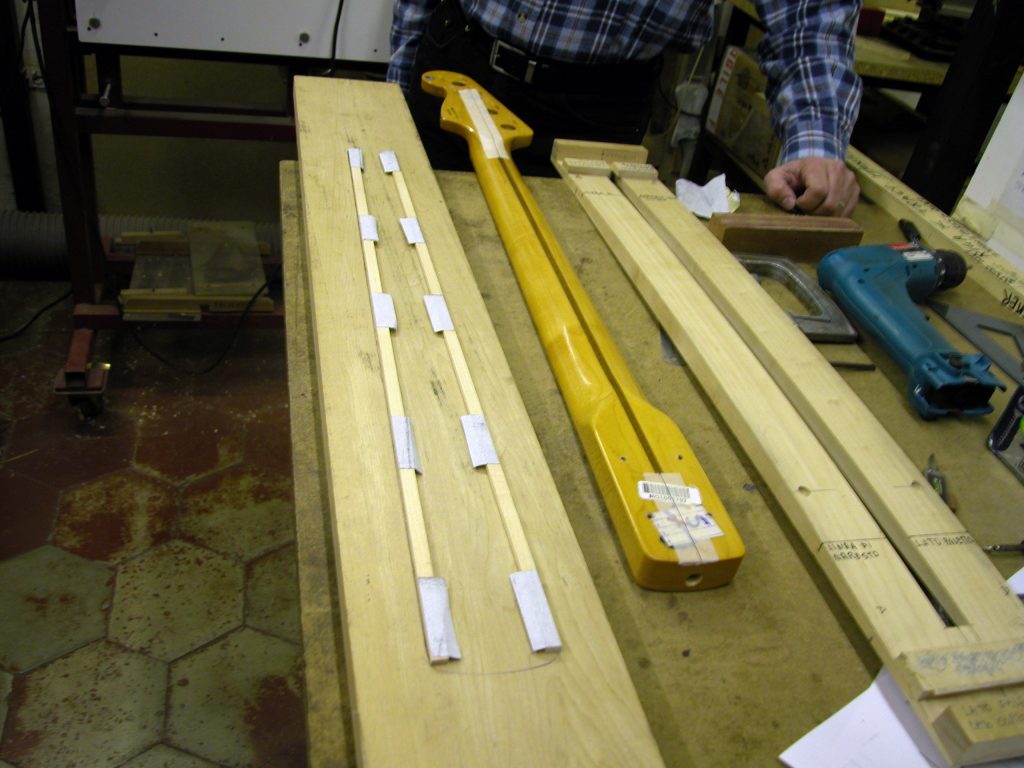 Quest’operazione è risultata difficile in quanto abbiamo dovuto costruire una guida curva aperta in mezzo che permettesse all’utensile di asportare in maniera precisa solo la striscia di noce e seguire la sede curva interna al manico che ospita il trussrod.