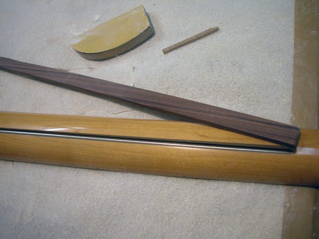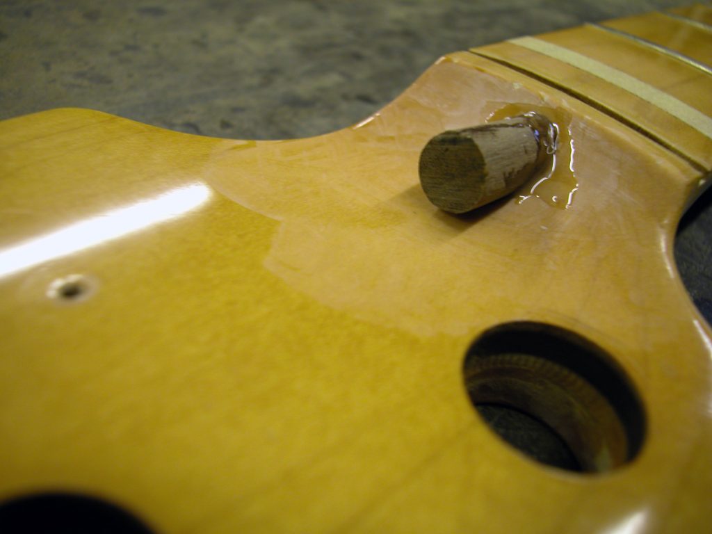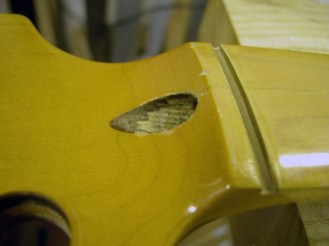 Questo vuol dire che per riparare il manico occorreva estrarre il trussrod fresando entrambe le parti di noce (retromanico e tondino della paletta).